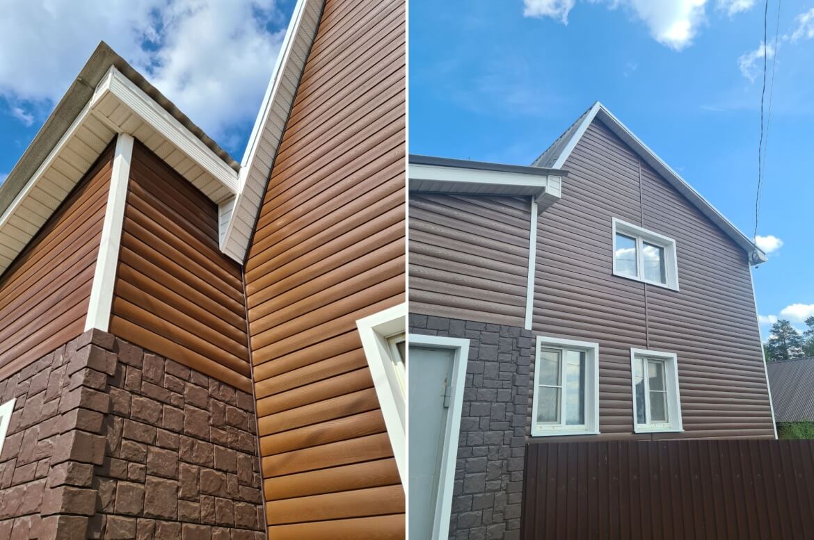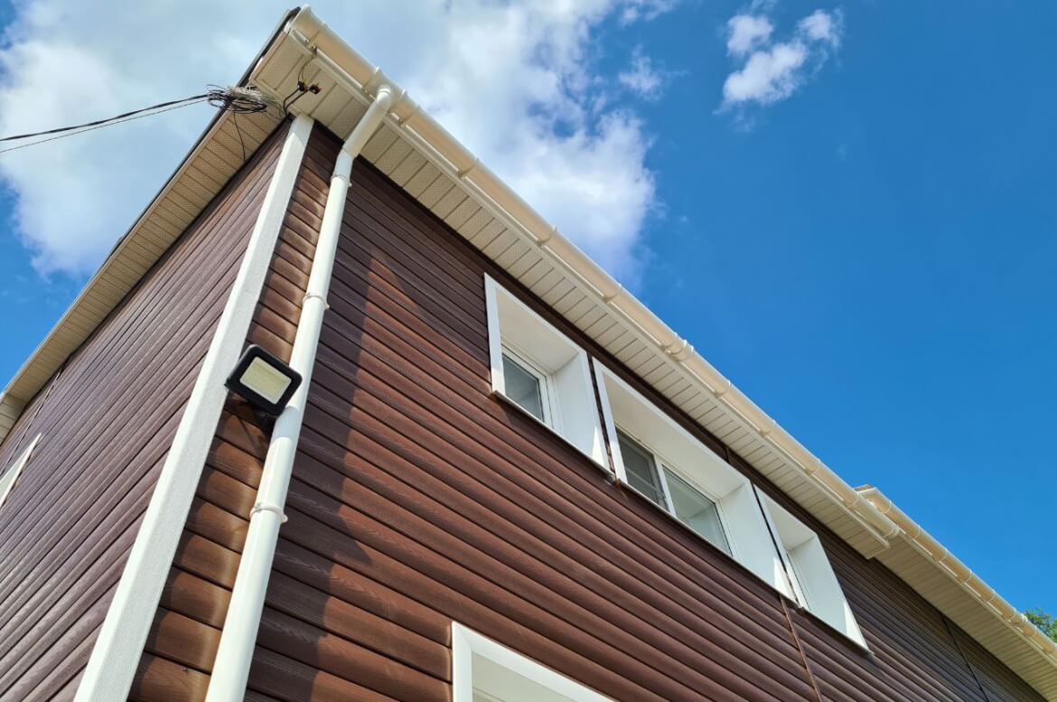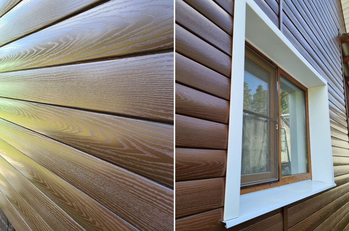 На фасаде очень красивый акриловый сайдинг от FINEBER. Глянцевый, с выраженной текстурой дерева. При производстве акрилового сайдинга добавляется специальный акриловый полимер, который повышает светостойкость панелей. Акриловый сайдинг, в отличие от простого коричневого, не выцветает.