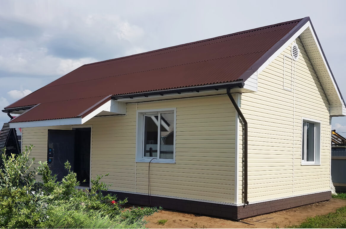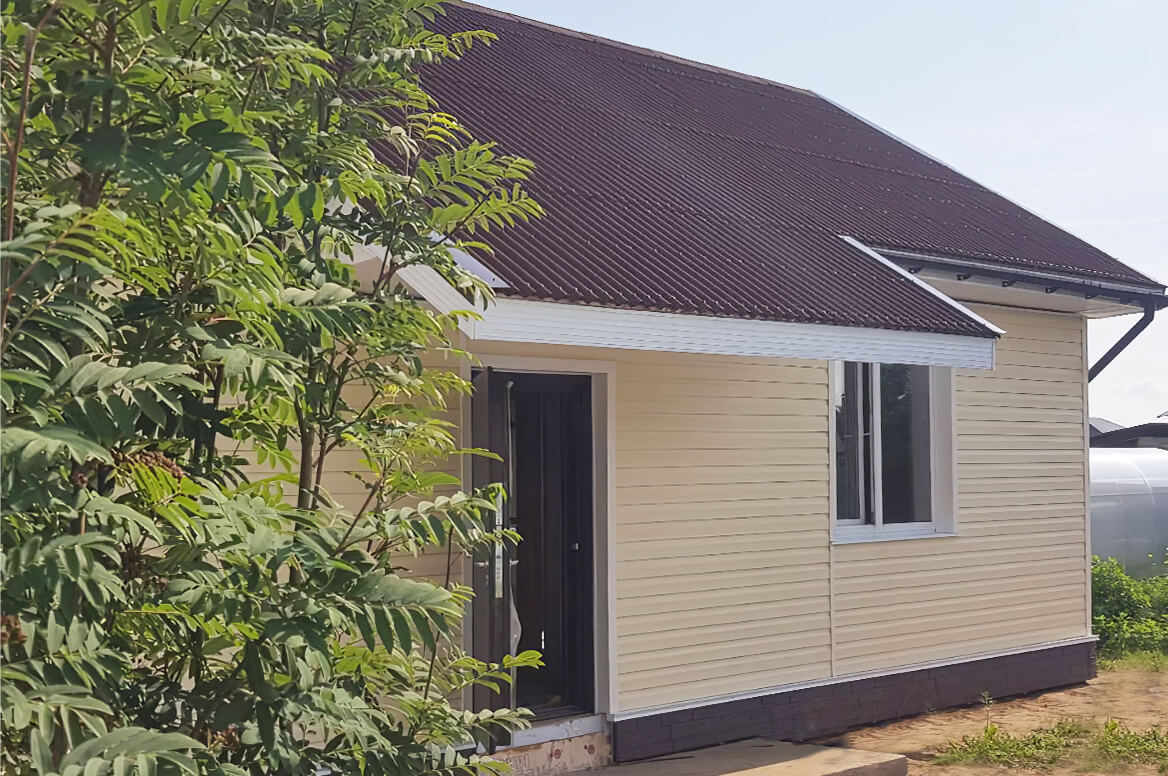 Белые доборные элементы, такие как углы, отлив, околооконная планка, только добавили дому целостности.
