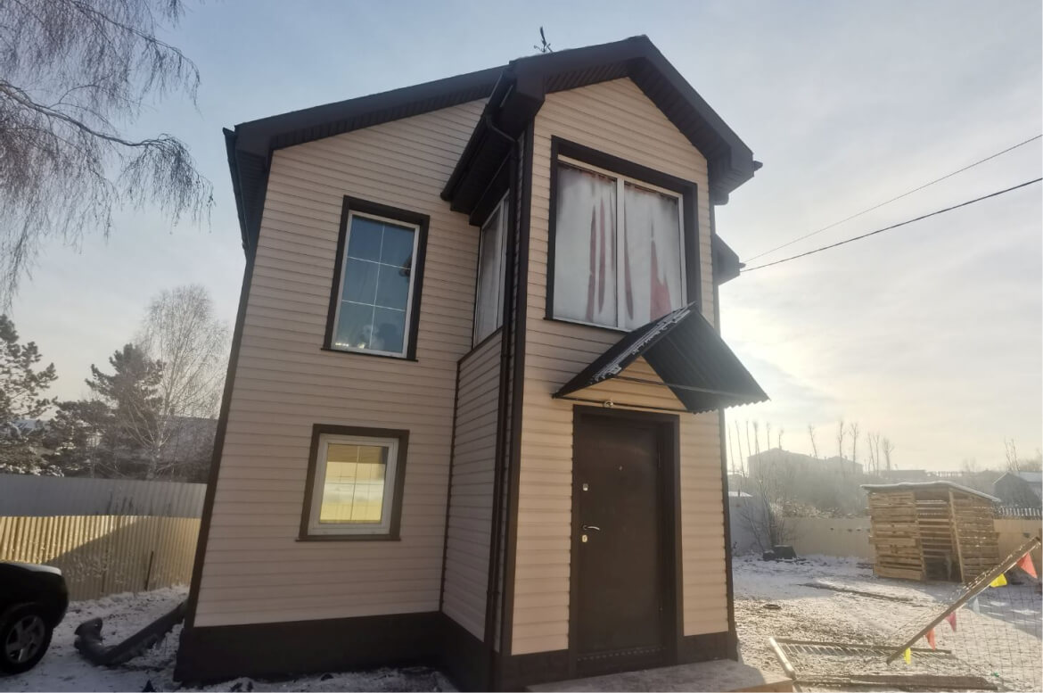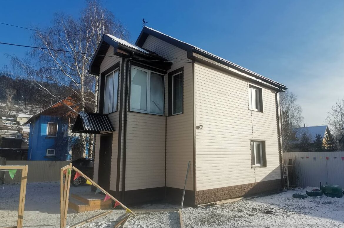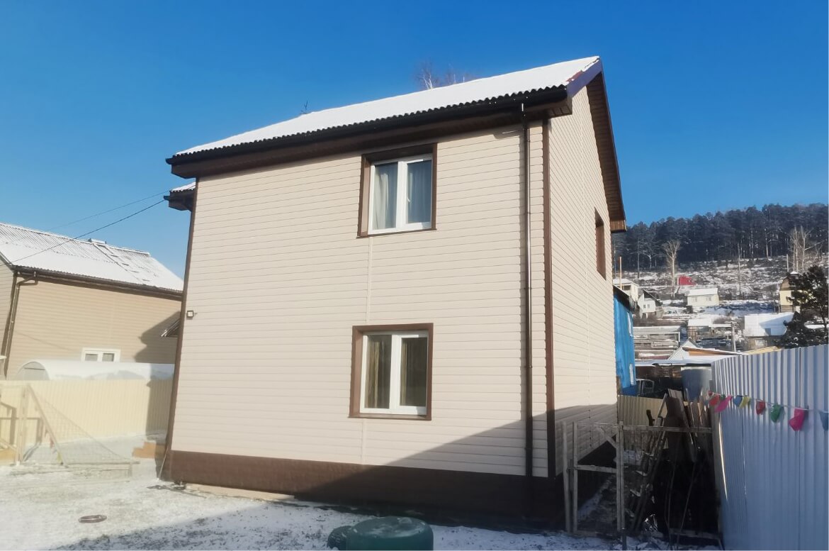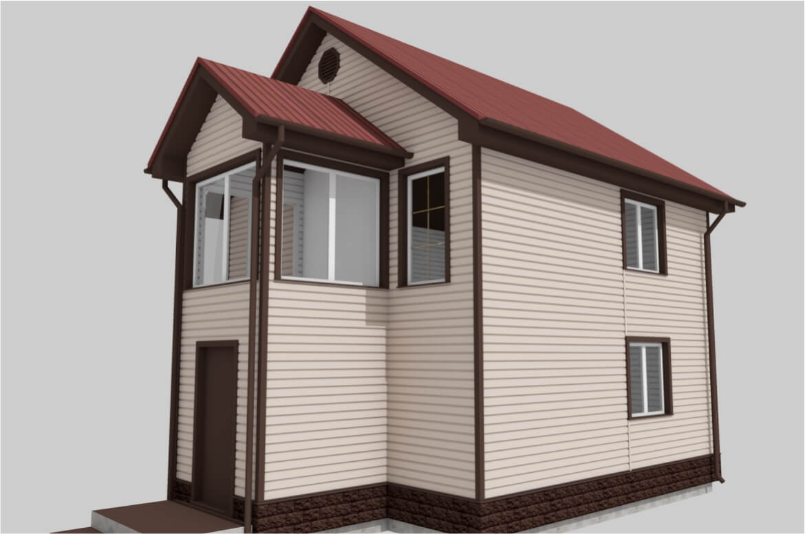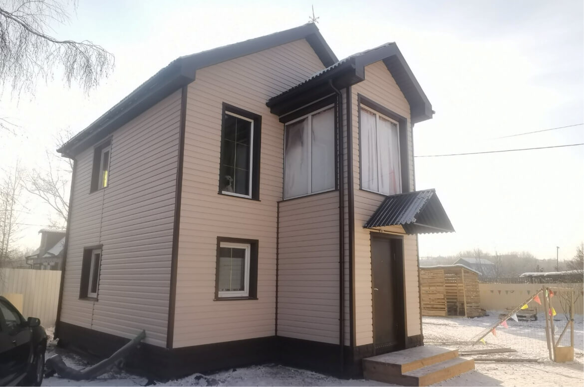 Клиенты выбрали классическое сочетание стен из бежевого сайдинга с цоколем из тёмного камня и контрастную отделку коричневого цвета. Размеры у дома небольшие, поэтому на главном фасаде удалось обойтись без использования соединительных элементов.