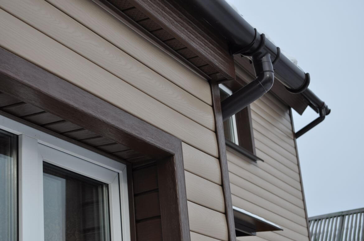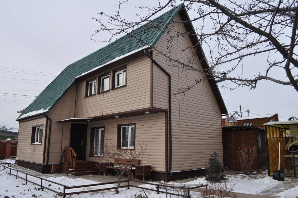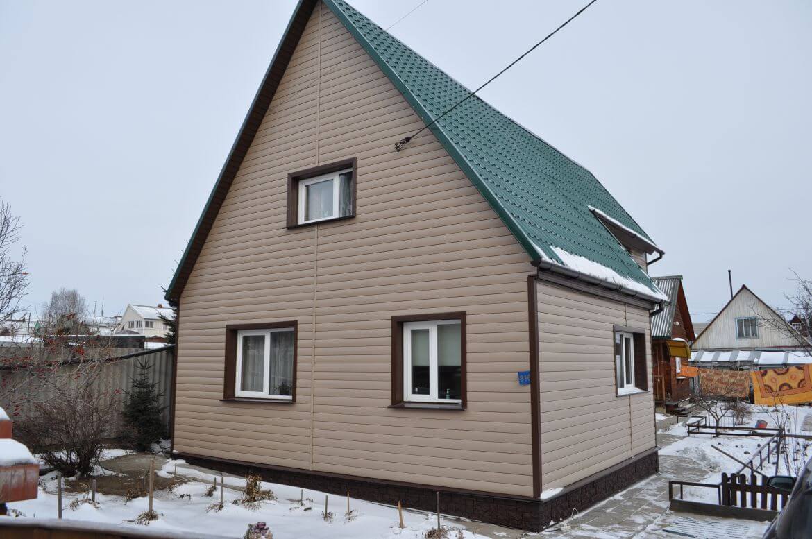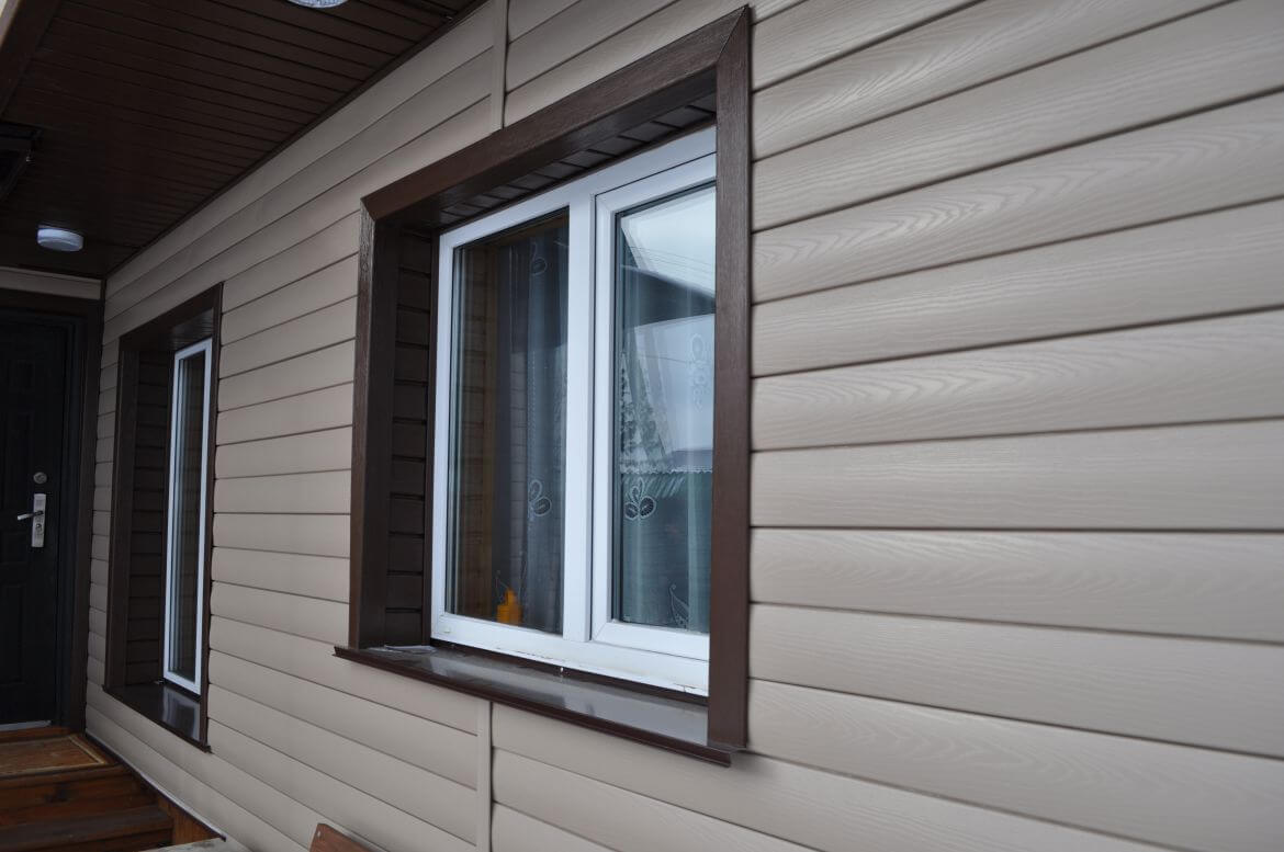 На фасаде смонтирован сайдинг FINEBER коллекция Blockhouse цвет Сандал, отделочные элементы FINEBER цвет Могано.