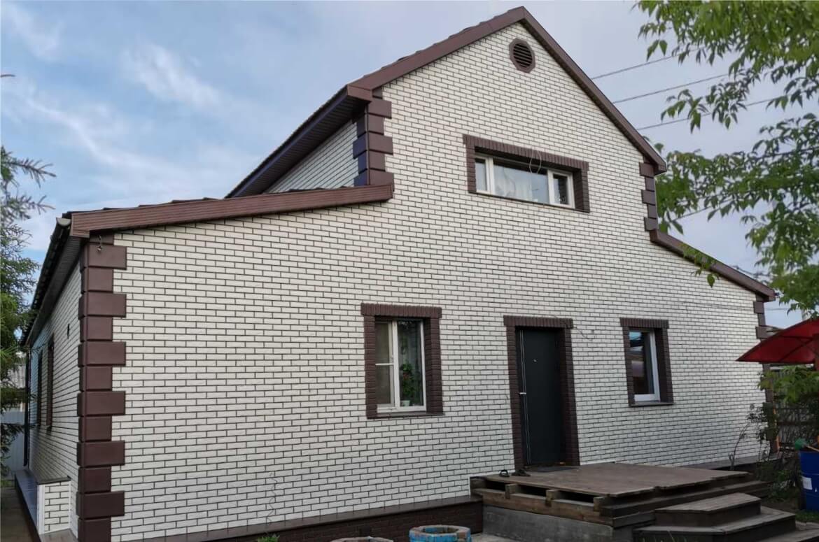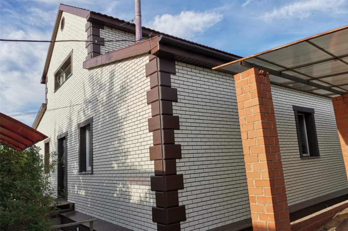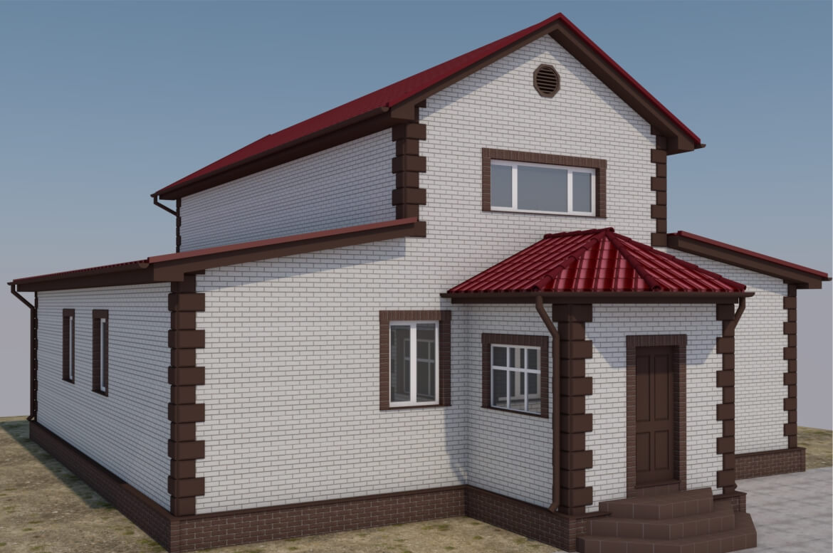 У FINEBER есть коллекция фасадных панелей «Кирпич Баварский». Рельефная панель, с глубокими швами и текстурированной поверхностью кирпича. На визуализации «примерили» фасад в разных исполнениях: тёмную кладку со светлой отделкой и белый кирпич с тёмно-коричневой отделкой. Клиенты остановили свой выбор на фасаде белого цвета и отделке углов «Альта-декор», имитирующей руст.