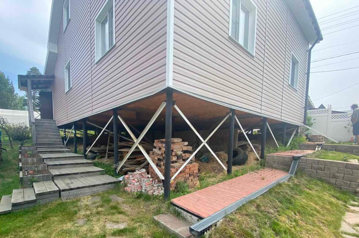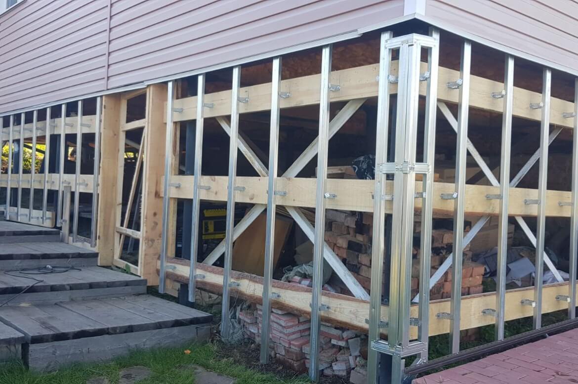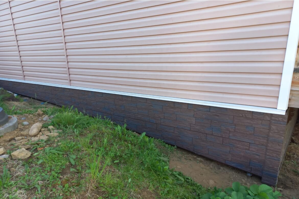 Частая проблема — цоколя нет вообще. Есть только пространство под домом. Как его закрыть? В данном случае сделали направляющие из досок, а уже к ним закрепили обрешетку для фасадных панелей. Кстати, сформировали еще и полноценный дверной проем. Красиво и практично.