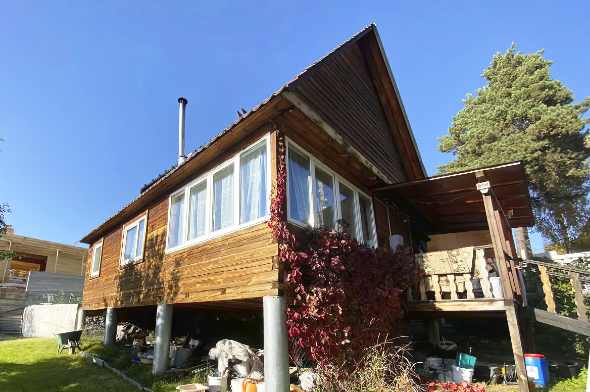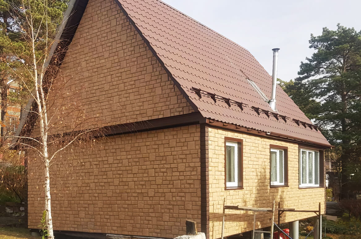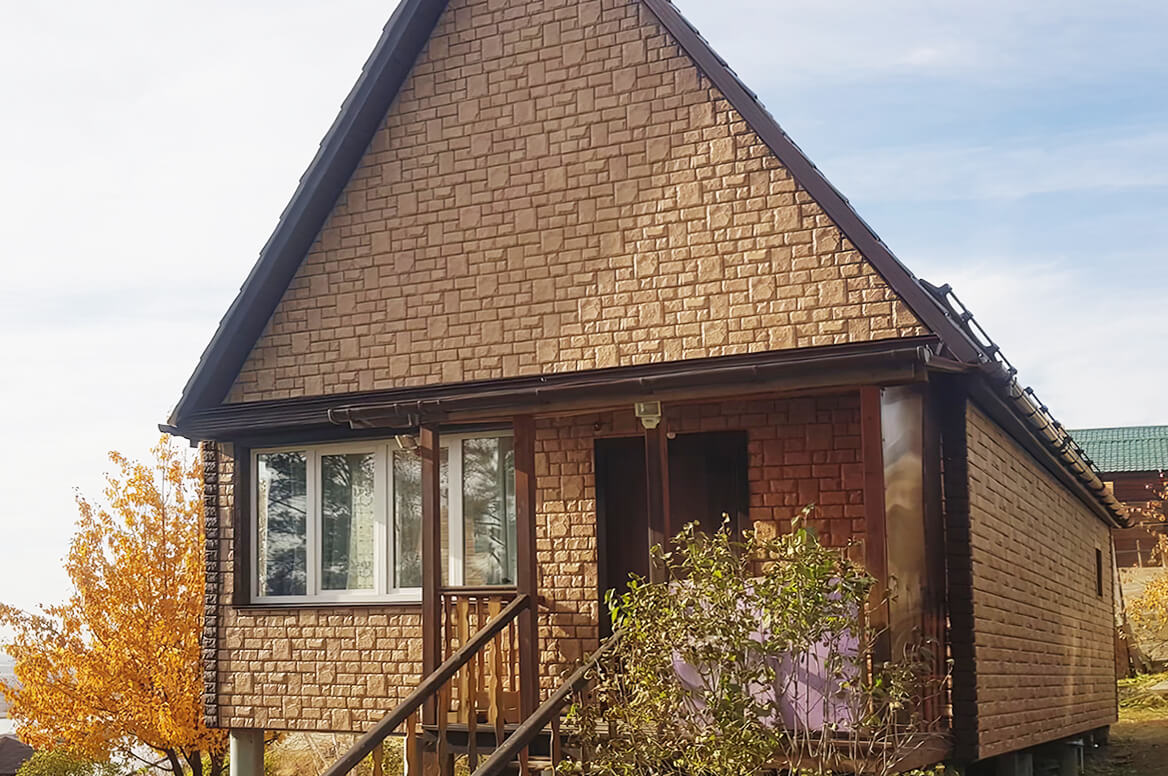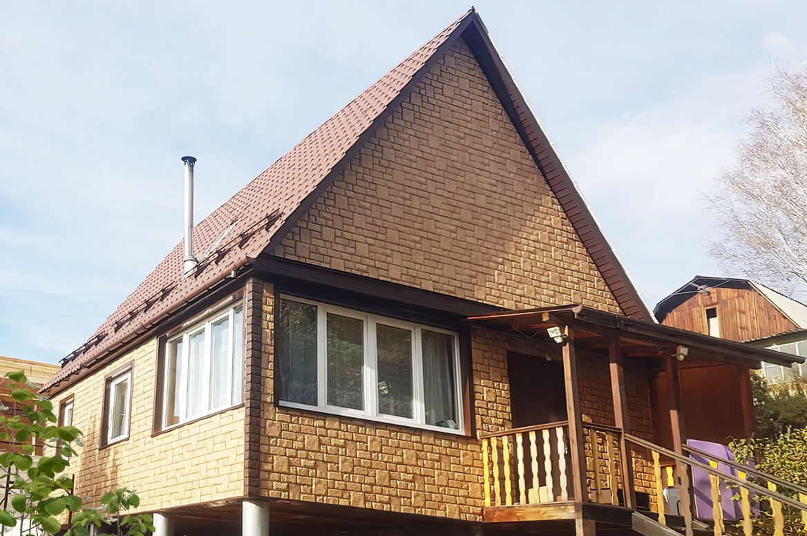 Тёплому янтарному оттенку идеально подходит коричневый цвет. Именно коричневые комплектующие использованы на доме: угол «Колотый камень», околооконная планка, софиты. Всё сочетается наилучшим образом!