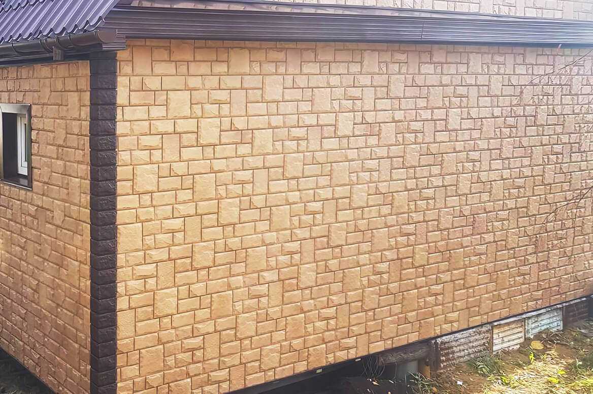 Стены — ПВХ панели GRAND LINE «ЯФасад», коллекция «Екатерининский камень», цвет Янтарь.