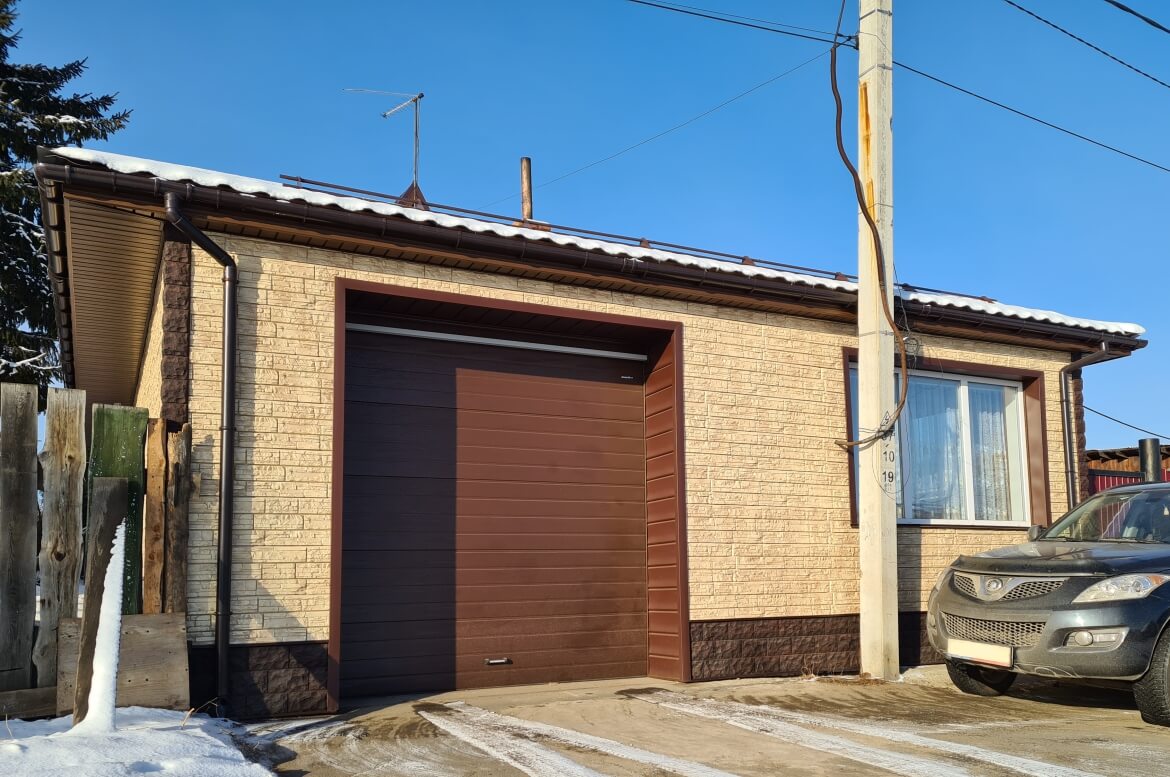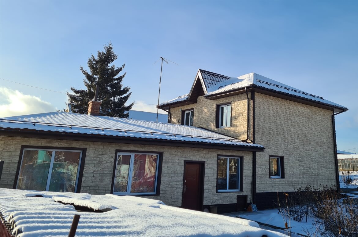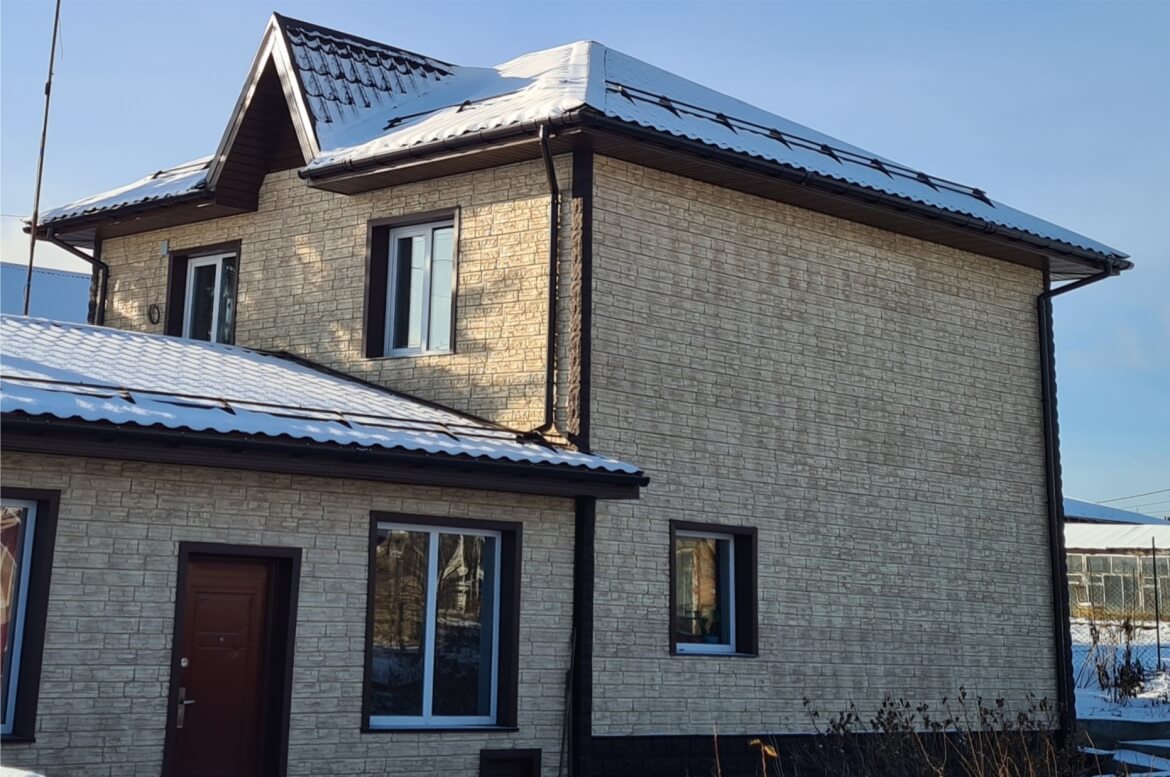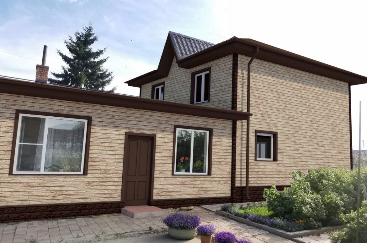 Цоколь, углы — фасадные панели FINEBER «Доломит» цвет Тёмно-коричневый.