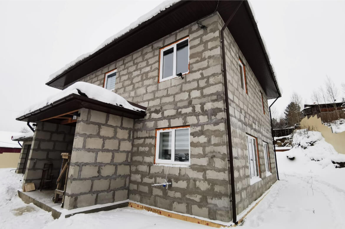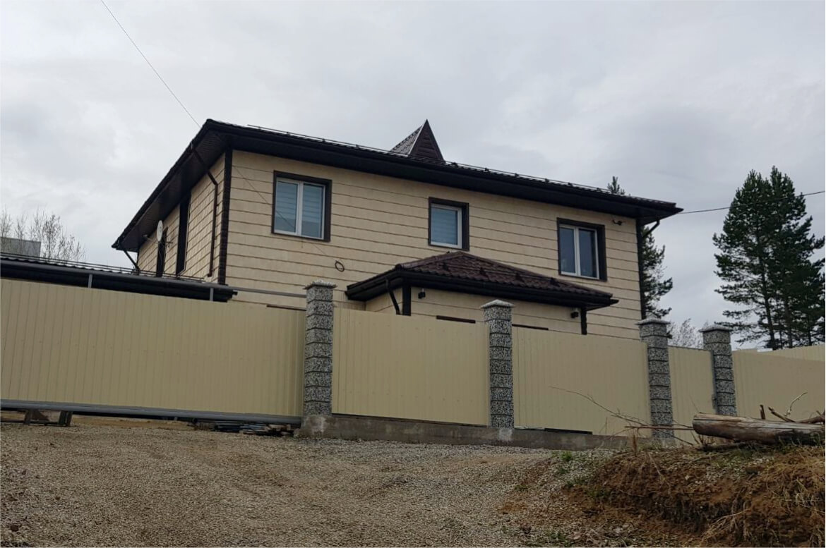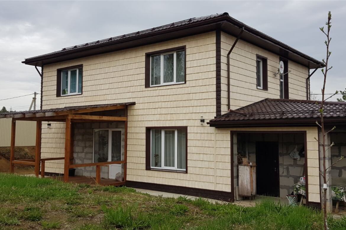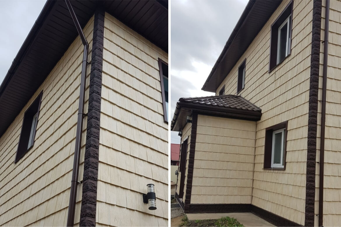 Фасадные панели серии «Дранка сибирская» имеют выразительную фактуру дерева. Цвет «Слоновая кость» формирует теплую и уютную атмосферу. Мягкий и нежный оттенок стен придает истинное благородство фасаду, а контрастная отделка углов «под камень» добавляет графичности образу. Благодаря этому большой дом не выглядит громоздким.