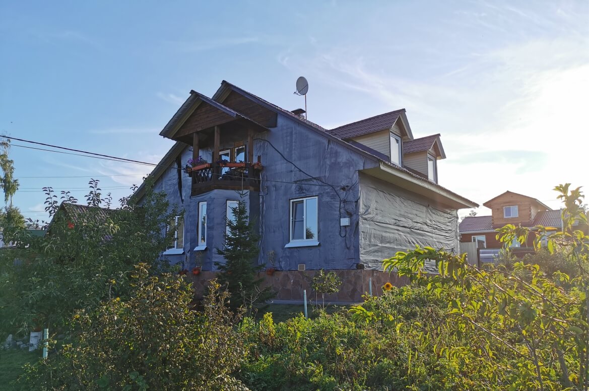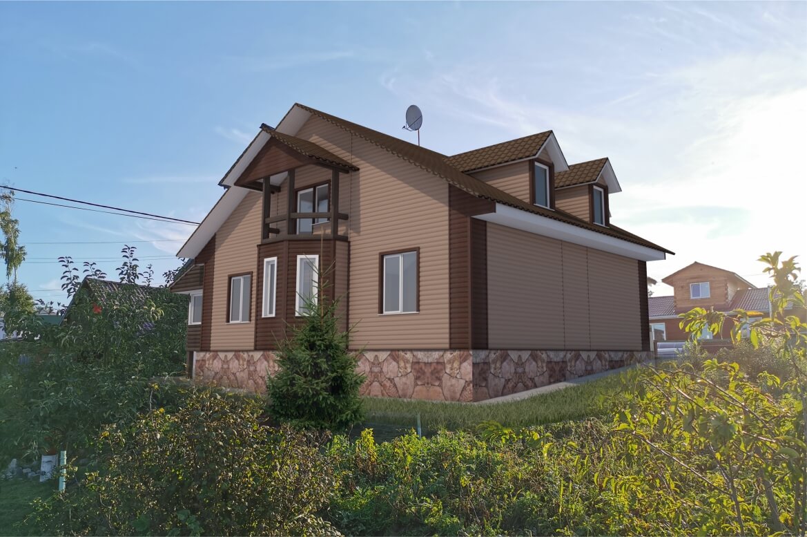Небольшой дом с мансардной кровлей, эркером и верандой. Цоколь отделан природным камнем теплого оттенка. Веранда обшита тёмным деревом. Чтобы поддержать существующую отделку, на фасаде скомбинировали сайдинг двух цветов. В тёмном цвете Могано выполнили эркер — акцентный элемент главного фасада, а также широкие углы. Основную плоскость стен оформили сайдингом тёплого бежевого цвета Сандал. Профиль сайдинга «Blockhouse» также выбран не случайно, он повторяет деревянную отделку веранды. Ширина темных углов принята с учетом длины панели сайдинга, так чтобы не было лишних соединителей, и чтобы количество обрезков было минимальным. Потому что фасад из сайдинга должен быть не только красивым, но и экономичным. Интересный момент: цвет отделки окон на фасаде не одинаковый. На сайдинге Сандал околооконные планки тёмного цвета, а на тёмном сайдинге Могано — белые. Подшивка карнизных свесов также выполнена в белом цвете. В отделке использовали много разных приемов, при этом фасад смотрится цельным и гармоничным.