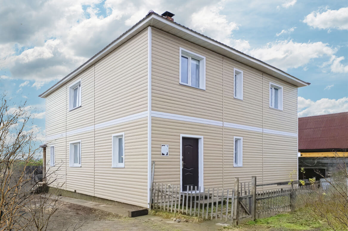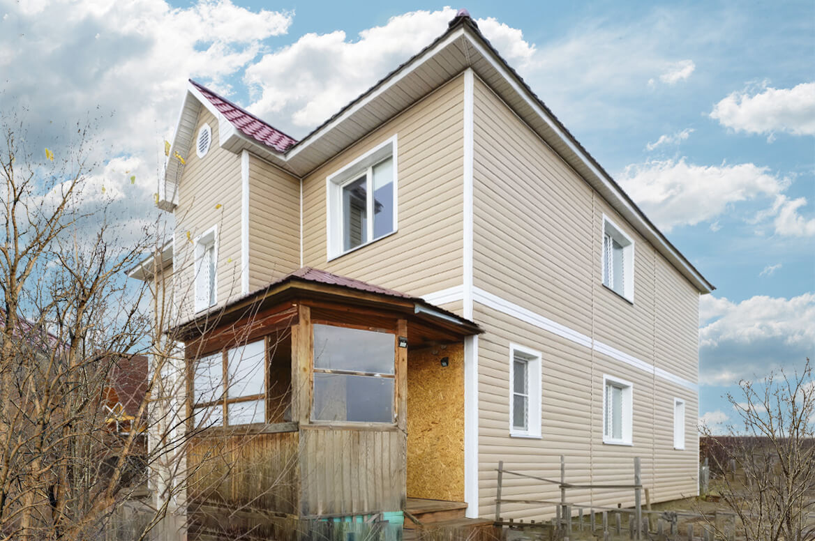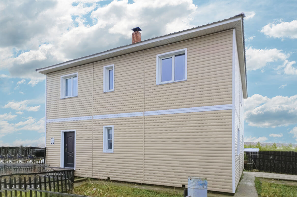 П еред вами пример того, как цвет дополнительных деталей может влиять на общий вид дома. Хозяева дома выбрали сайдинг от компании FINEBER цвета Сандал. Чаще всего данный цвет используется с коричневыми доборными элементами. Но здесь выбор пал на белые комплектующие, и дом стал выглядеть светлее.