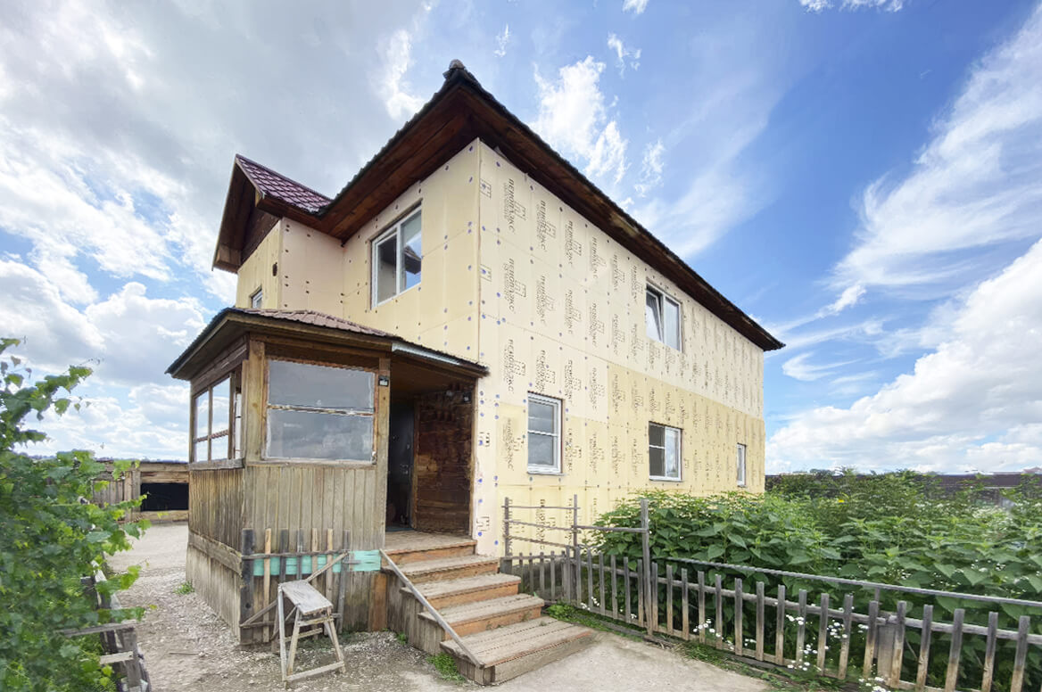 Комплиментом к основному фасаду выбрали белые углы. Этажи разделили белыми вертикальными вставками. Светлый образ завершили белыми околооконными планками, белыми софитами и белой вентиляционнной решёткой KROVENT. Цоколь решили пока не делать.