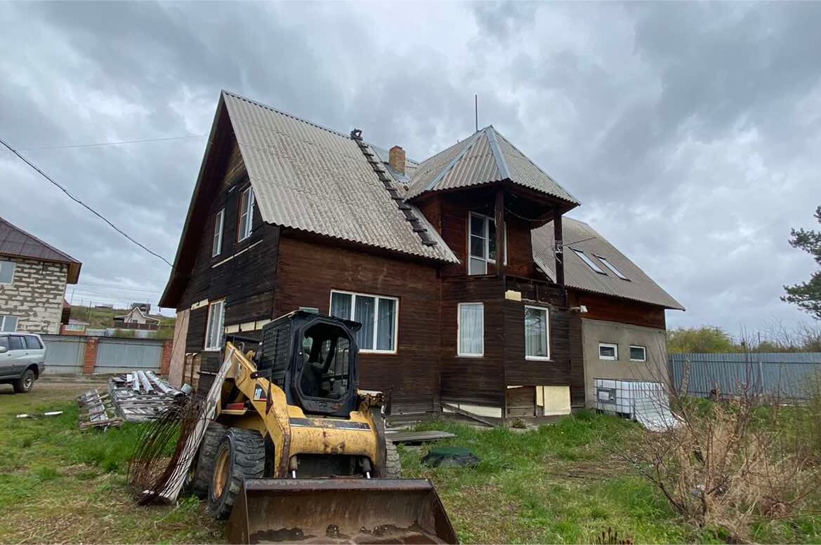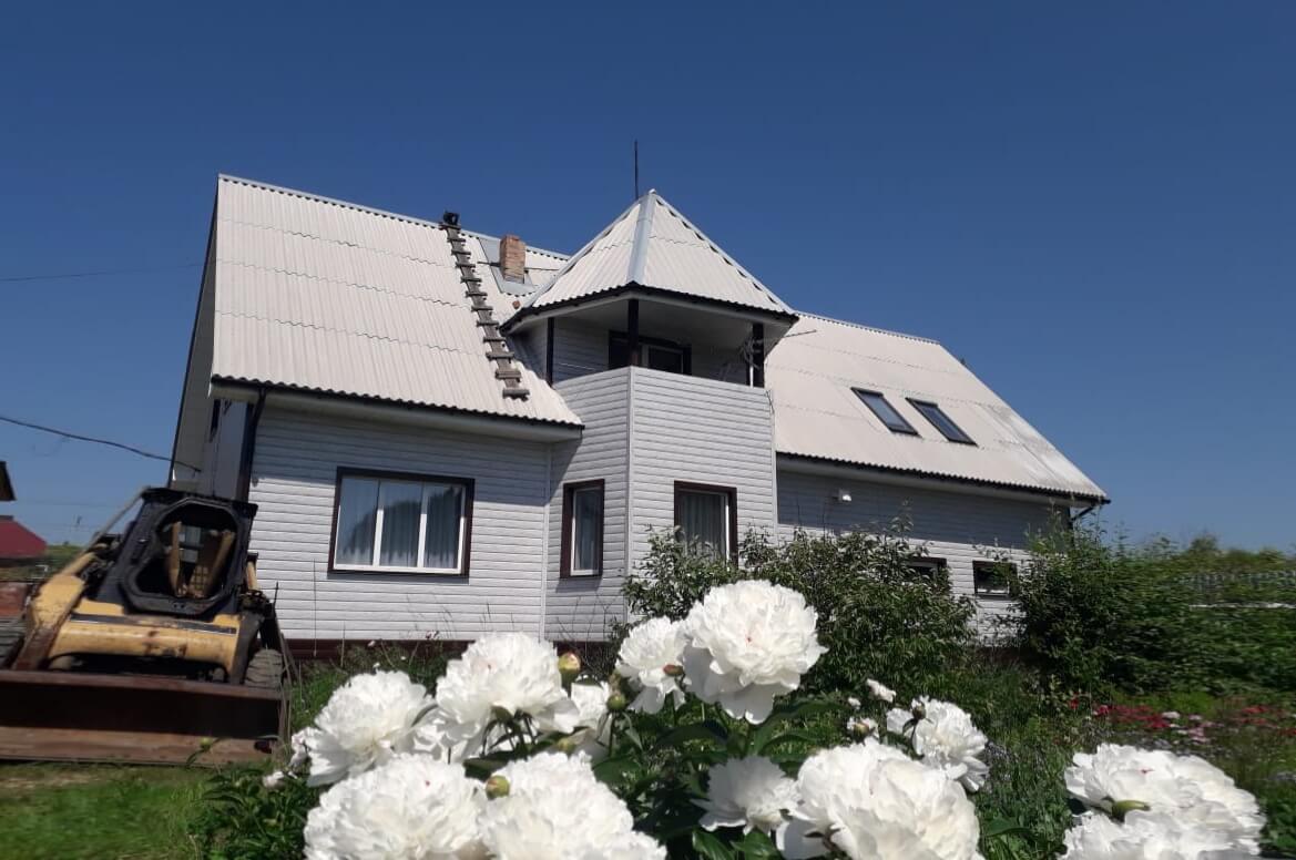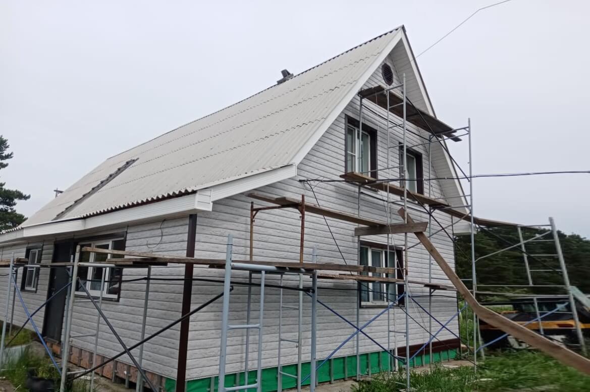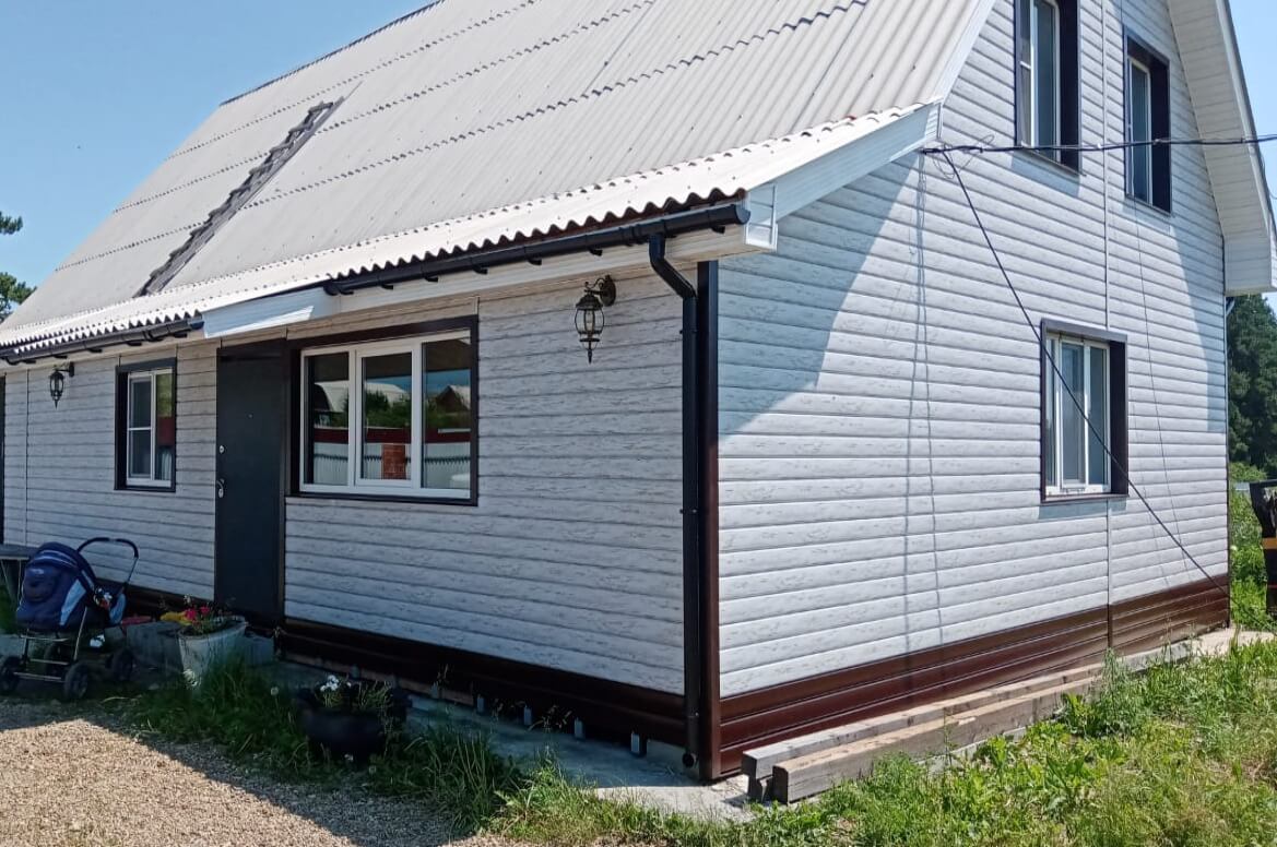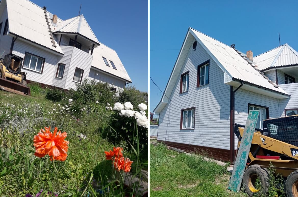 Деревянный дом преобразился до неузнаваемости! Профиль сайдинга «под бревно», рисунок имитирует дерево. Цоколь выполнен из металлосайдинга коричневого цвета. Отделка контрастная, RAL8017. Карнизы — белые, они лучше подходят к светлому цвету кровли. Получилось здорово!
