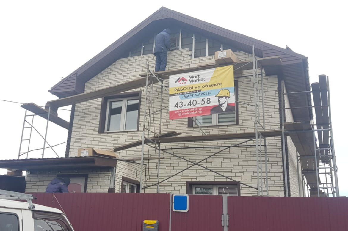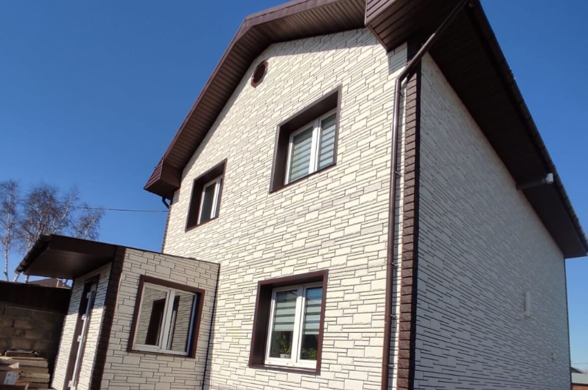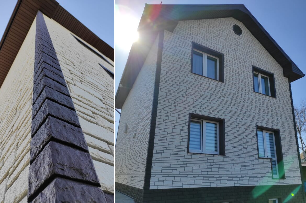 Цоколь и углы отделаны фасадными панелями «Колотый камень». Панели имитируют грубую кладку из колотого гранитного камня.