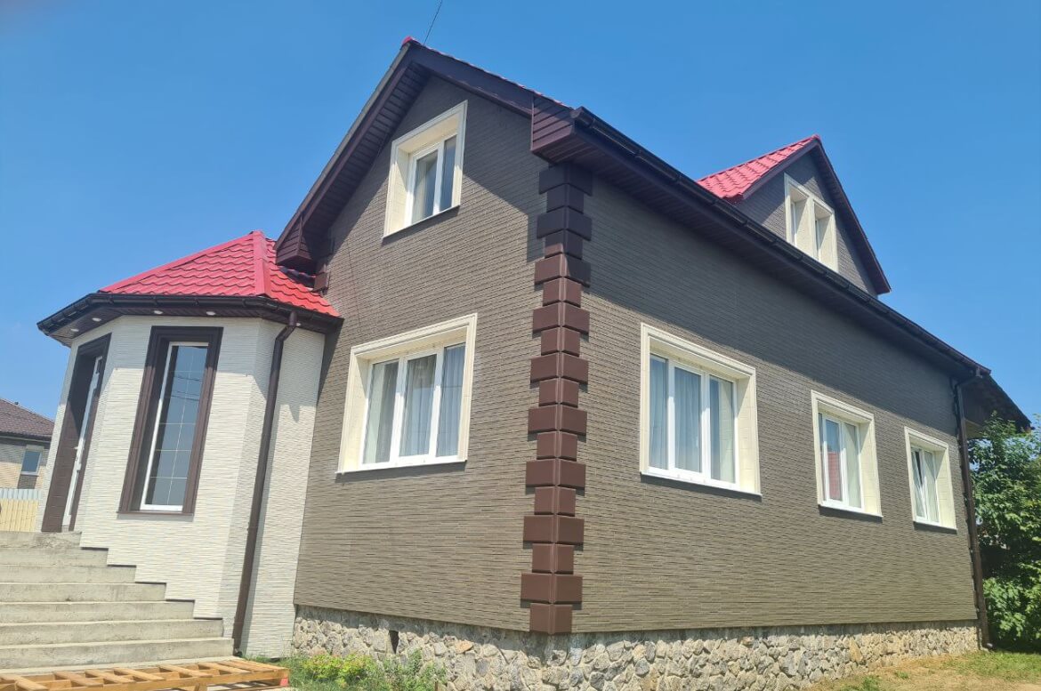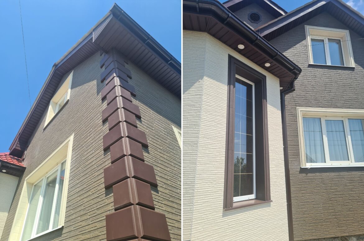 Эффектным дополнением к столь выразительному фасаду стала отделка углов дома и оконных проемов декоративными элементами «Альта-декор». Они выполнены из полипропилена, но имитируют гипсовую лепнину. Обычно на наружные углы устанавливается специальный фиброцементный угол, либо осуществляется запил панели с последующей герметизацией места стыка. В данном случае панели заведены в пазы декоративных элементов, просто и эстетично.