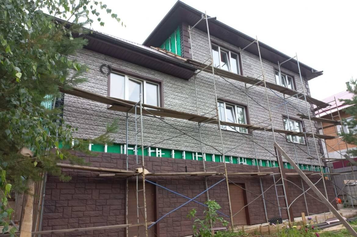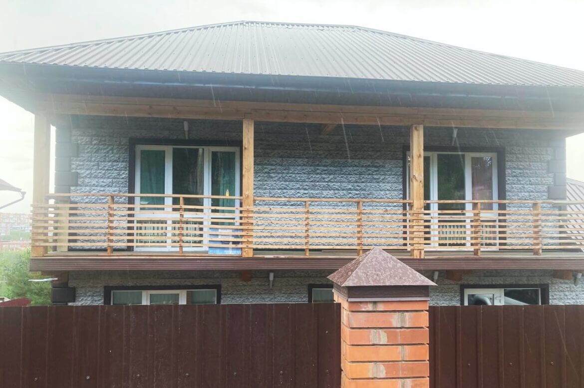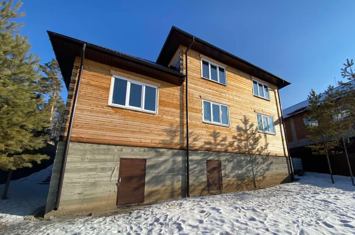 Этот большой дом в пригороде Иркутска сложен из профилированного бруса. У данного материала есть недостаток: после полной усадки бруса образуются щели, которые почти невозможно законопатить. Так произошло и с этим домом, стены стали продуваться. Потребовалось утепление дома и, как следствие, новый фасад.