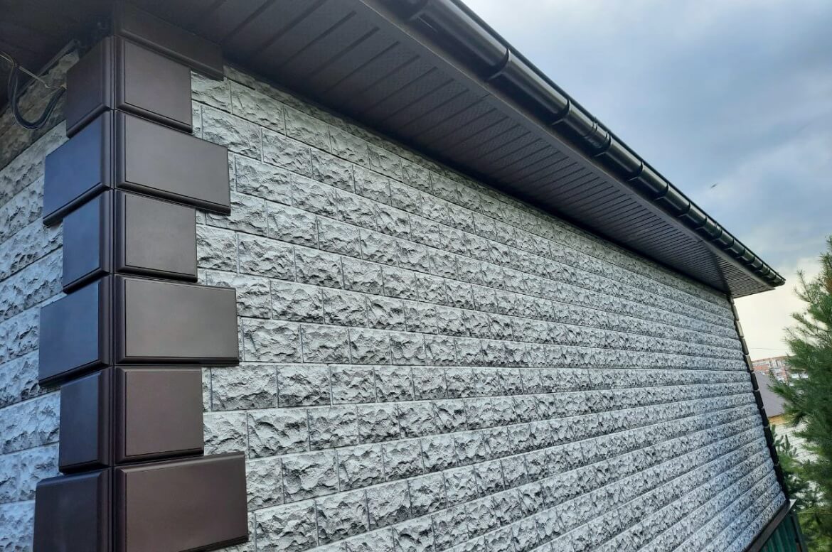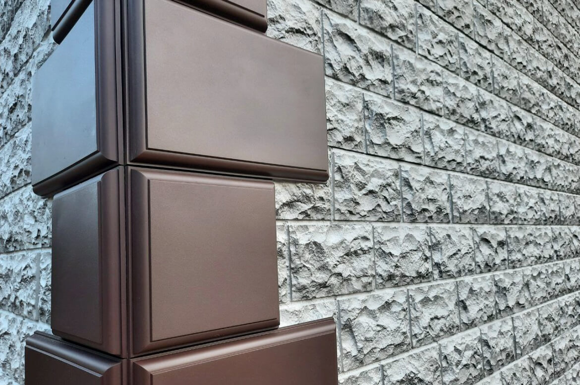 Для отделки высокого цоколя применена фасадная панель «Камень крупный» от FINEBER. Панель очень прочная и жесткая. Основные плоскости стен оформлены фасадными панелями с 3D окрашиванием «Доломит», имитирующими кладку из крупного тесанного камня. Наружные углы — декоративные элементы «Альта-декор» в виде рустовых камней.