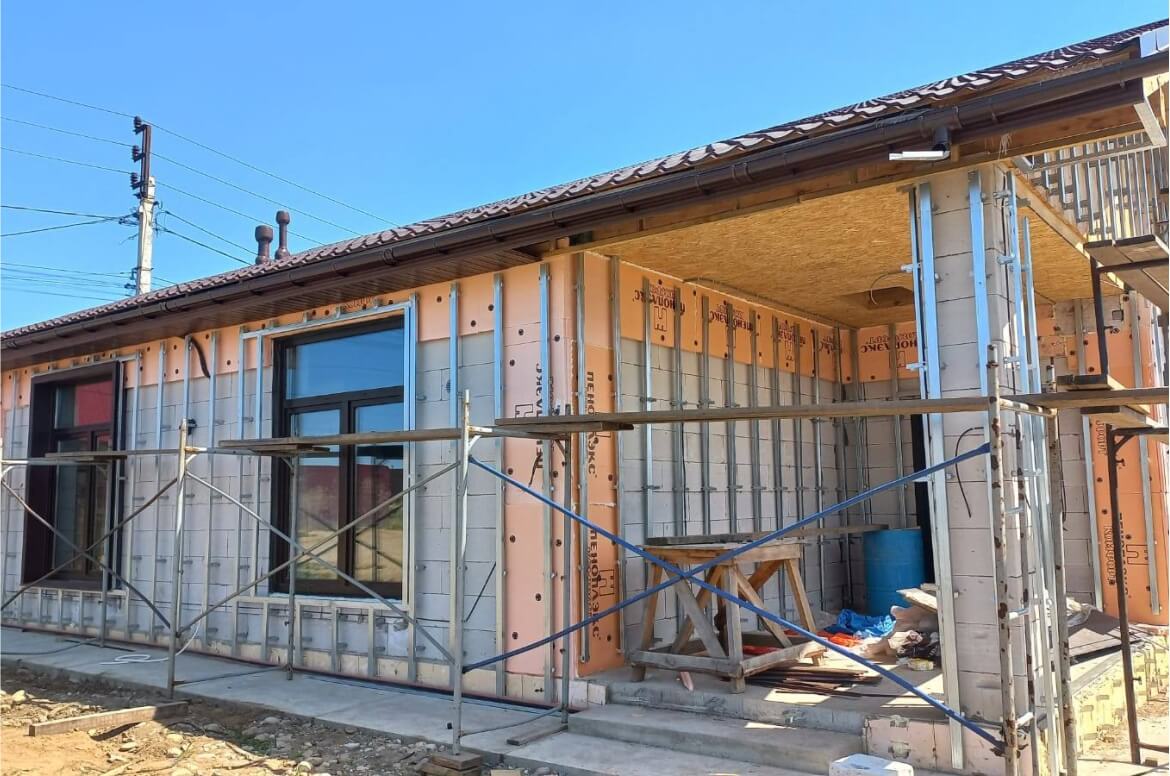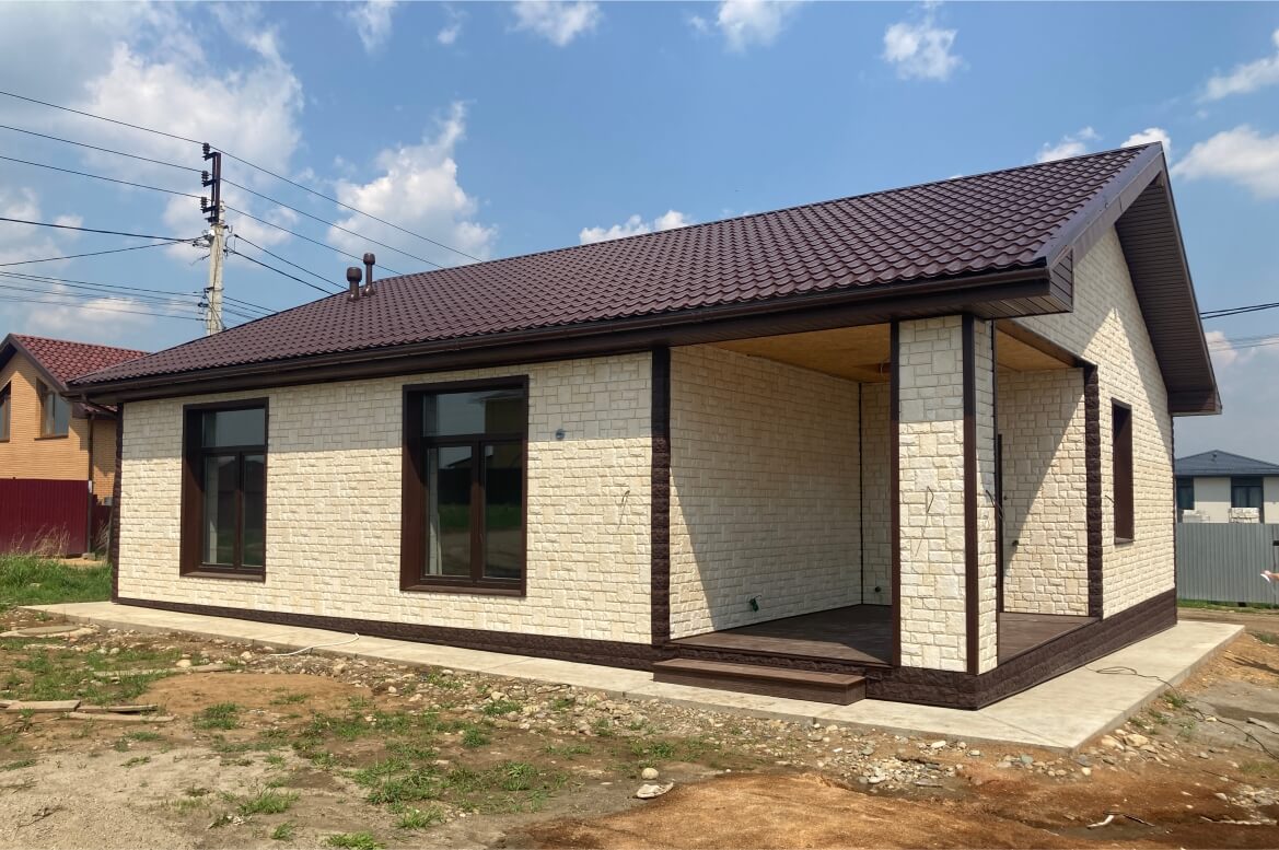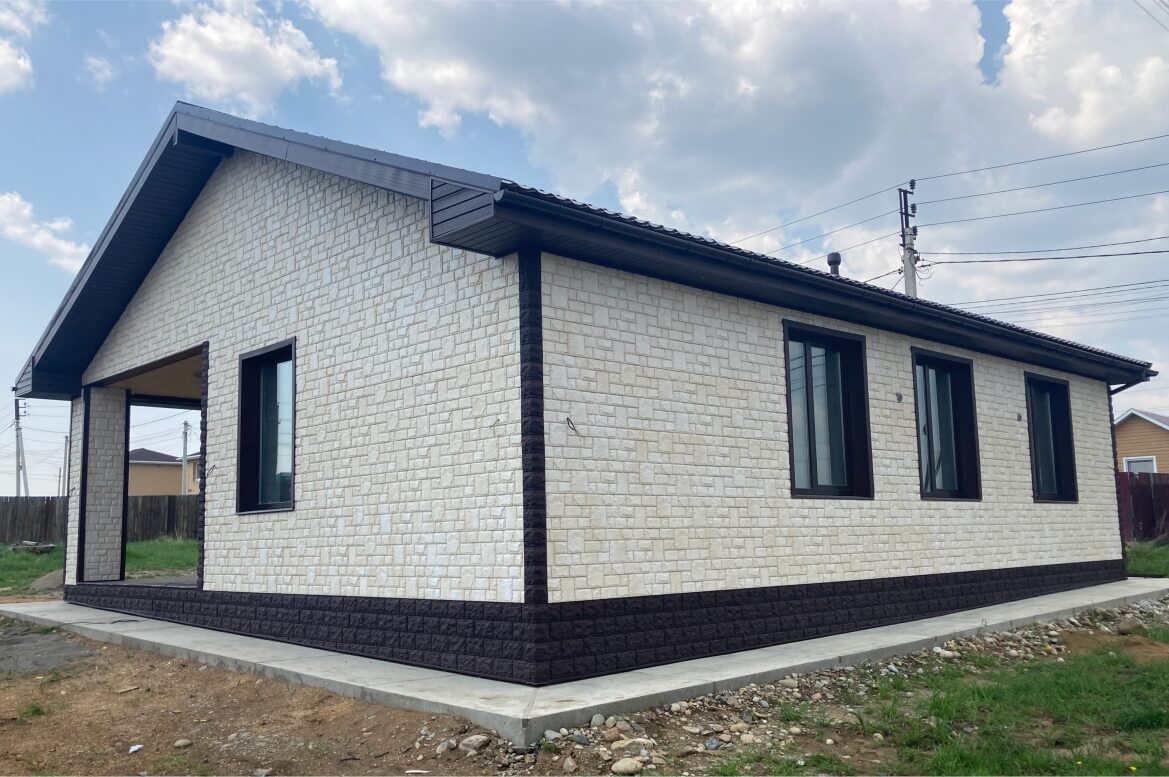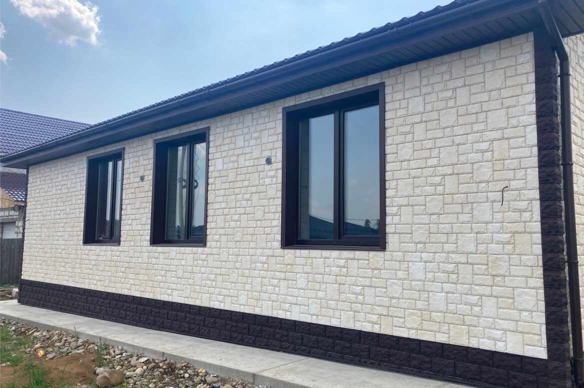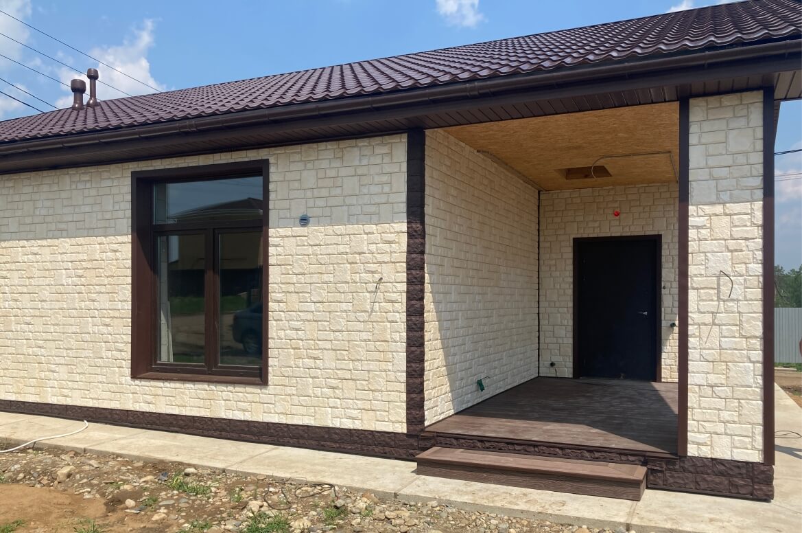 Панели «Екатерининский камень», использованные в проекте, воссоздают текстуру каменной поверхности, что, по сравнению с отделкой обычным сайдингом, существенно улучшает внешний вид здания. За счет своей формованной структуры, панели «Екатерининский камень» имеют повышенную прочность и долговечность. Они устойчивы к ударам, погодным условиям, ветровым нагрузкам и возможным повреждениям. Производитель GRAND LINE дает пожизненную гарантию на панели формованного сайдинга «ЯФасад»! Также, благодаря формованной структуре сайдинга, он легче и аккуратнее укладывается на стены здания: без соединителей и лишних обрезков.