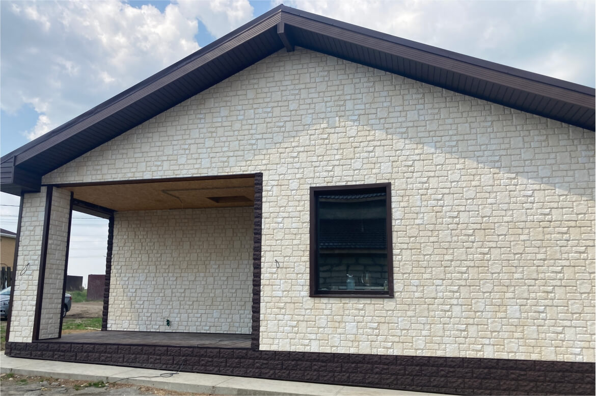 Для цоколя использованы полипропиленовые фасадные панели FINEBER «Доломит» насыщенного коричневого цвета. Цоколь и стена выполнены в одной плоскости без отлива. Для отделки наружных углов также применены угловые элементы «Доломит». Создается эффектное контрастное сочетание. Карнизы цвета Могано из акриловой коллекции FINEBER. Они устойчивы к выгоранию, и имеют ярко-выраженную текстуру поверхности.