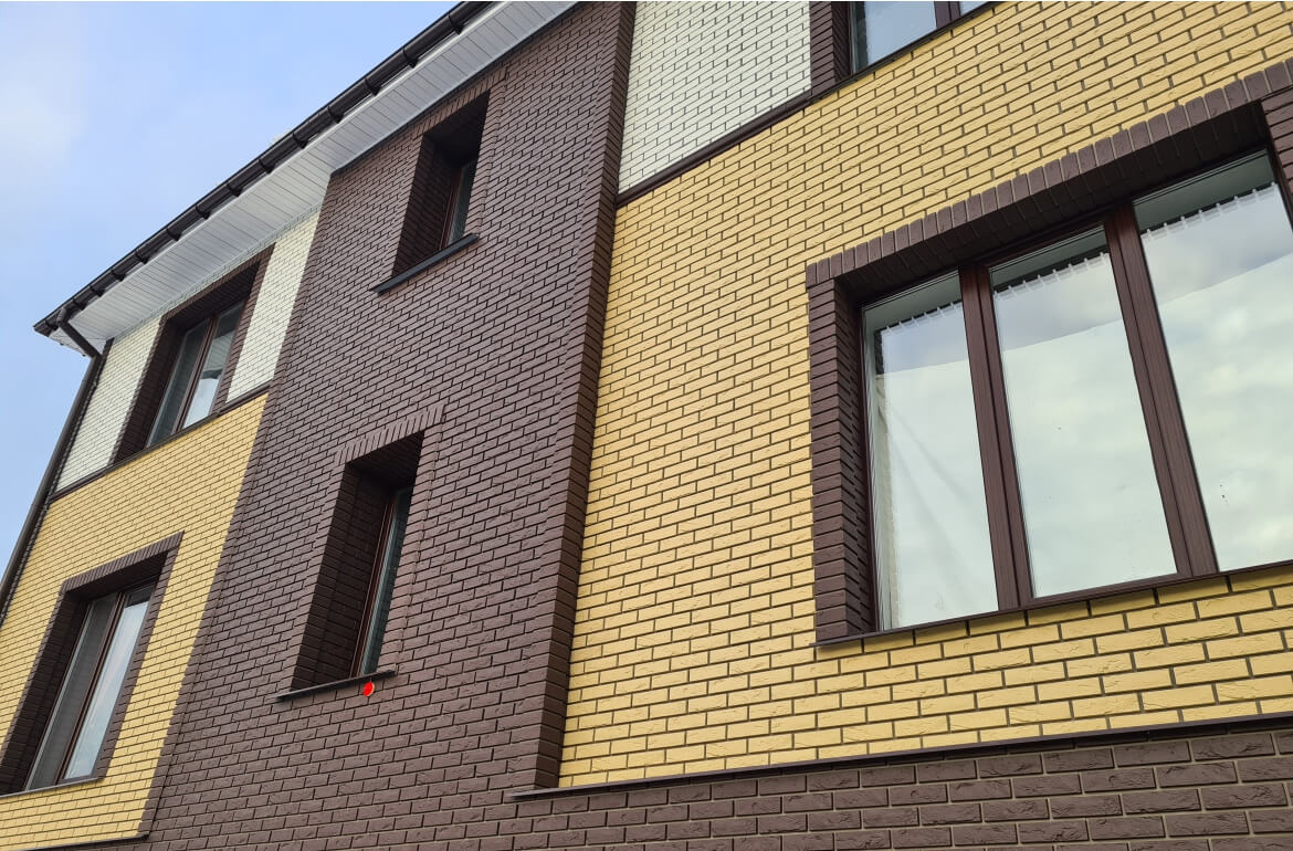Стандартный вариант — фасадный сайдинг, имитирующий кирпич. Традиционными считаются панели белого, терракотового, желтого и темно-коричневого цветов. Они подойдут для строгих домов в классическом стиле. А придать некую изюминку типовым постройкам можно с помощью углов для фасадных панелей контрастного цвета. Стоит отметить, что это довольно бюджетный вариант облицовки дома, поскольку цена фасадных панелей, например, под кирпич гораздо ниже, чем облицовочного кирпича.