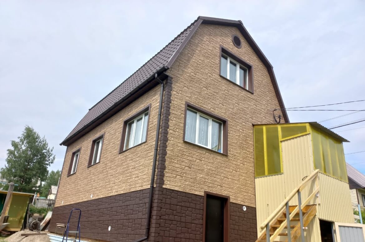Отличное сочетание. Цоколь «Крупный камень» насыщенного шоколадного цвета. Стены тёплого карамельного оттенка «Крымский сланец» Янтарь. Выразительные углы. Вкусно? Ещё бы.