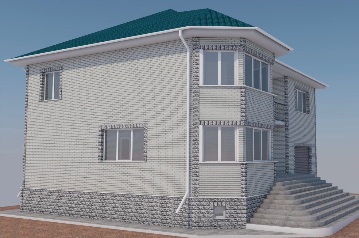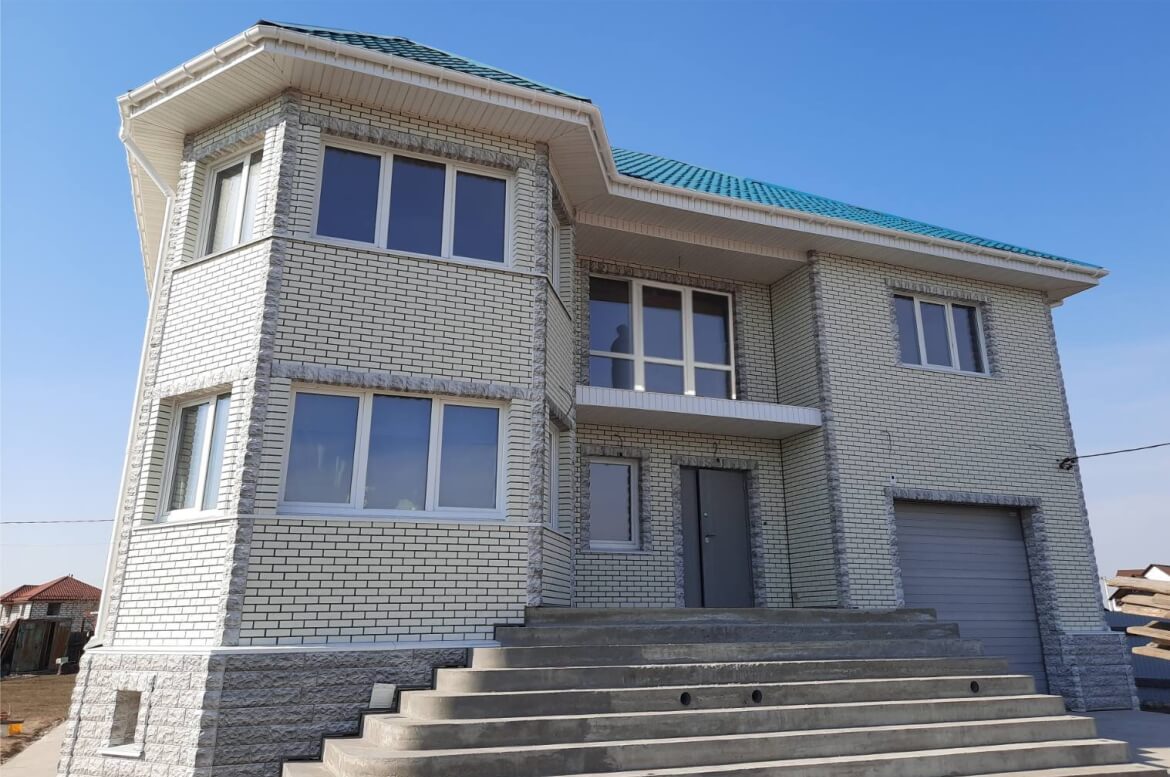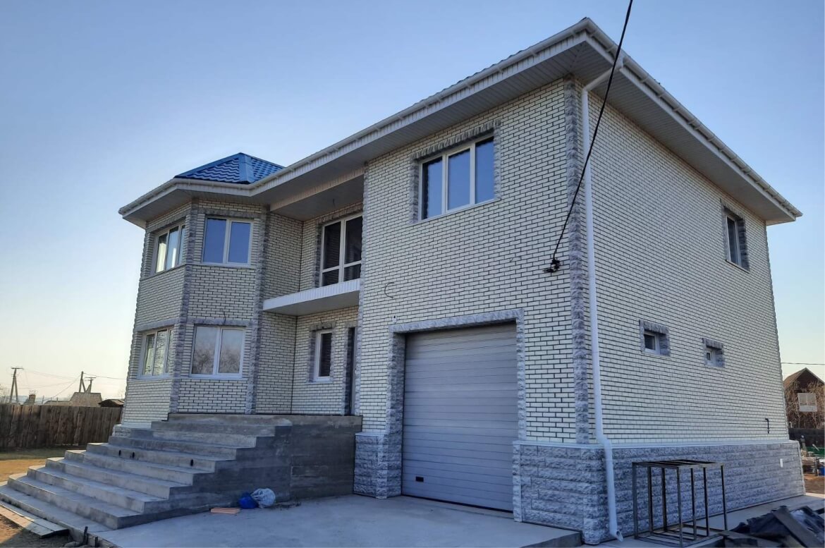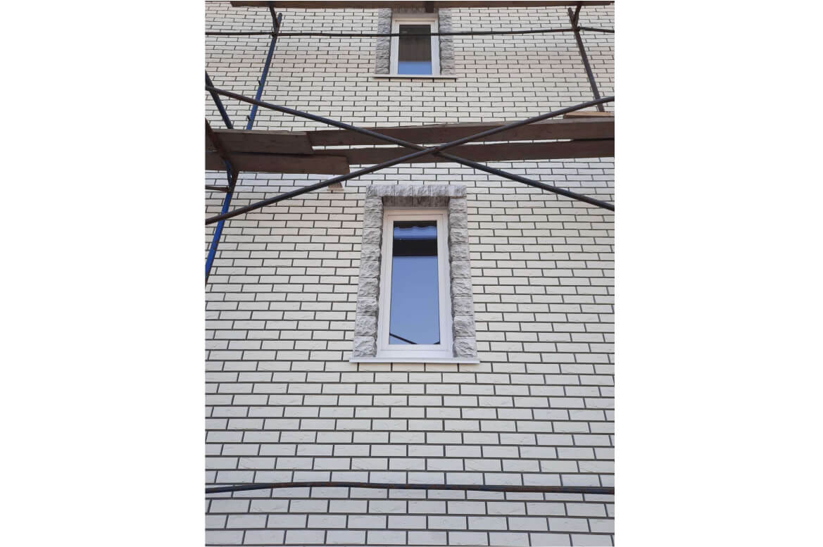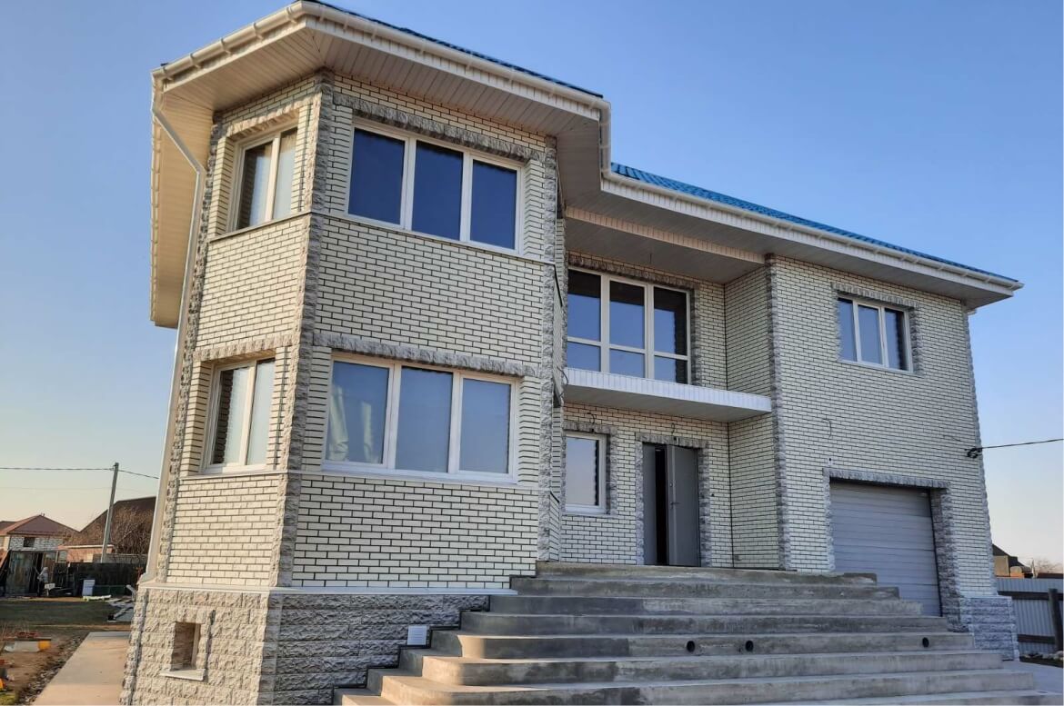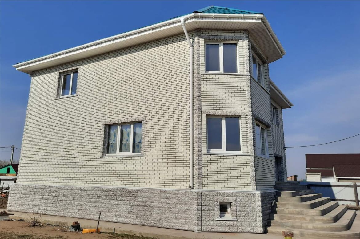 «Кирпич Баварский» очень красивая и фактурная панель, заказчики изначально остановили на ней свой выбор. А вот решение относительно цоколя и отделки углов нашлось на сразу.