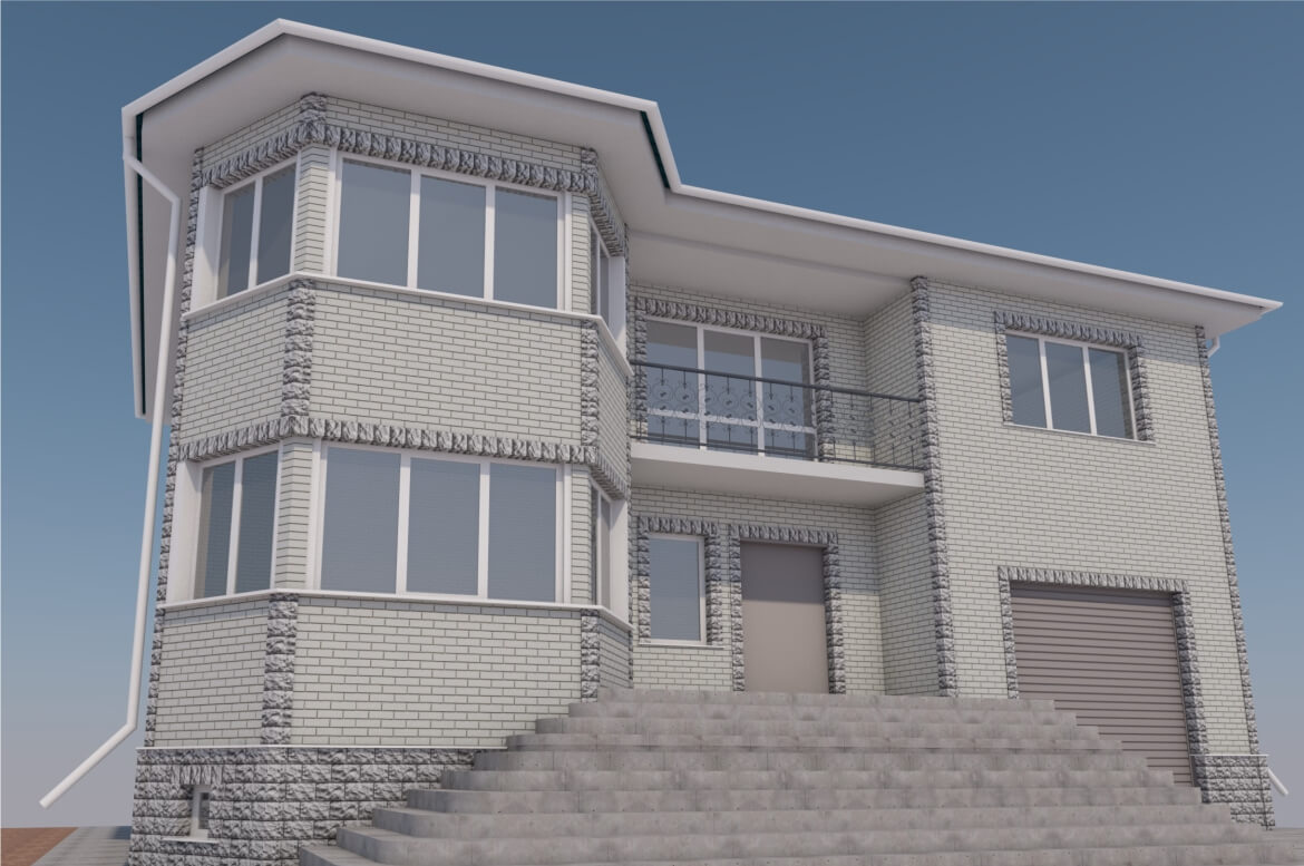 Дом получился просто шикарный. Он не выглядит чрезмерным. Все архитектурные элементы «заиграли»: и крыльцо, и эркер, и балкон, смещенный вглубь относительно плоскости фасада. И, конечно, удачное сочетание «тёплой» кирпичной плоскости стен с «холодным» каменным цоколем.