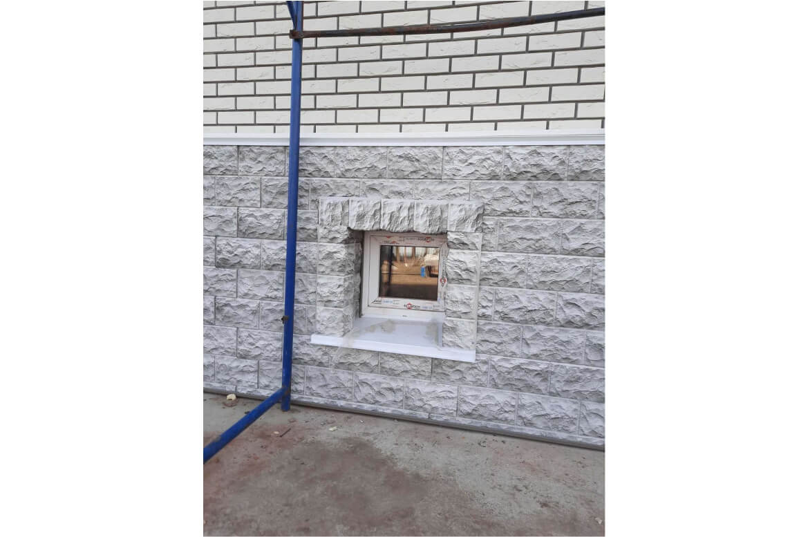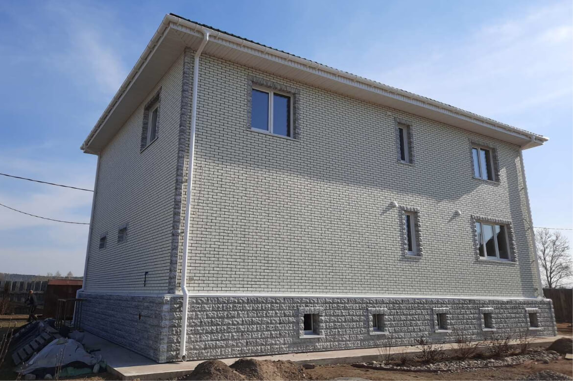Отделка цоколя — фасадные панели FINEBER «Доломит» цвет светло-серый.