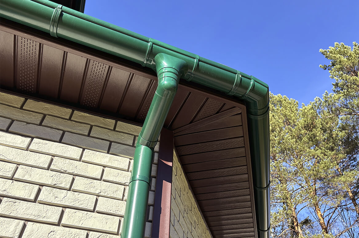 Особым акцентом здания является зеленая крыша. Обычно заказчики боятся использовать яркую кровлю, но в данном случае зелёный цвет вписывается очень органично. И Поэтому было решено подчеркнуть ее водосточной системой в том же цвете от завода-изготовителя GRAND LINE. Использованная для этого серия Design отличается расширенной объемной воронкой и скругленной выступающей заглушкой. Элегантные элементы усиливают общую концепцию здания.