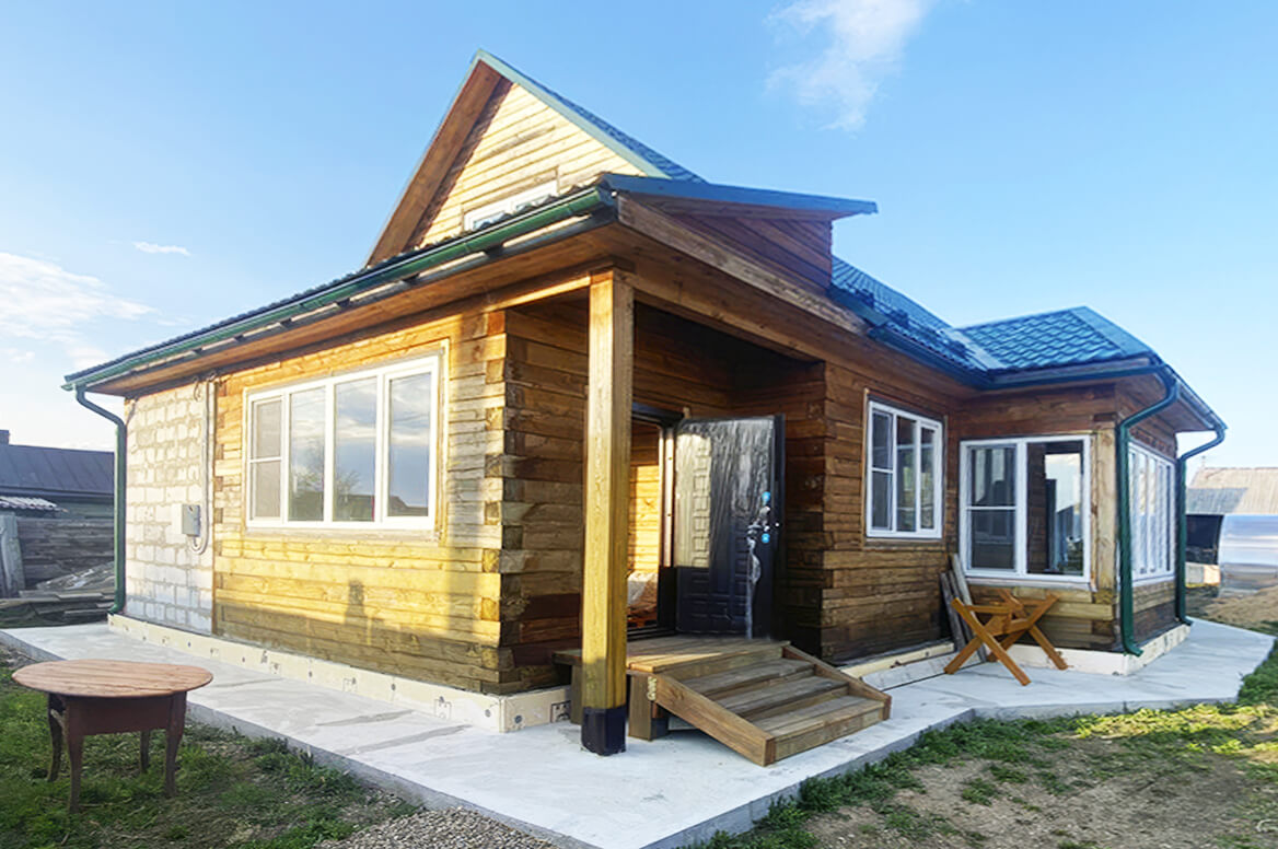 Перед вами очень аккуратный дом из бруса. Хозяева уже успели смонтировать на него кровлю, водосточную систему и утепление цоколя. Не хватало только фасада. И для этой важной роли были выбраны фасадные панели «Кирпич Клинкерный» от FINEBER.
