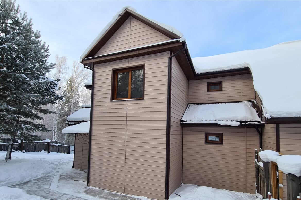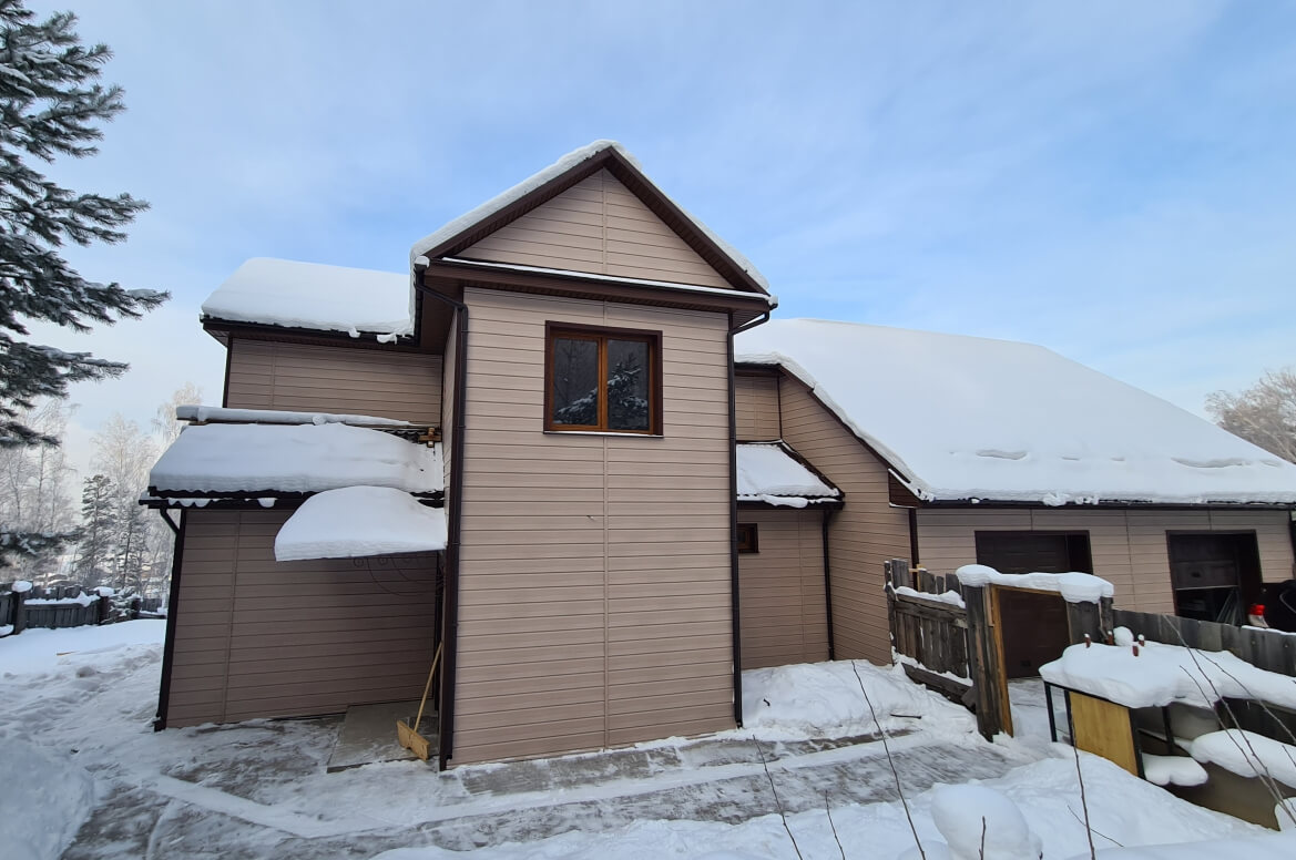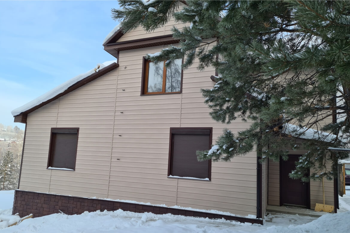 Дом сложной конфигурации, много фронтонов — но именно это придает дому шарм и уникальность. На фасаде смонтирован сайдинг GRAND LINE из дизайн коллекции Tundra. Высота панели 18 см, как и у настоящего бруса. У сайдинга красивая и благородная текстура поверхности, имитирующая вековые кольца дерева. Длина панели 3,0 м. Для отделки цоколя использованы жесткие фасадные панели «Камень Крупный» от FINEBER. Пожалуй, это самые красивые и прочные цокольные панели на рынке. Текстура — крупный тесанный камень, окрашивание многослойное. Отделка углов, окон, карнизов выполнена комплектующими Темный дуб из акриловой коллекции GRAND LINE. Монтаж выполнила компания «Март Маркет».