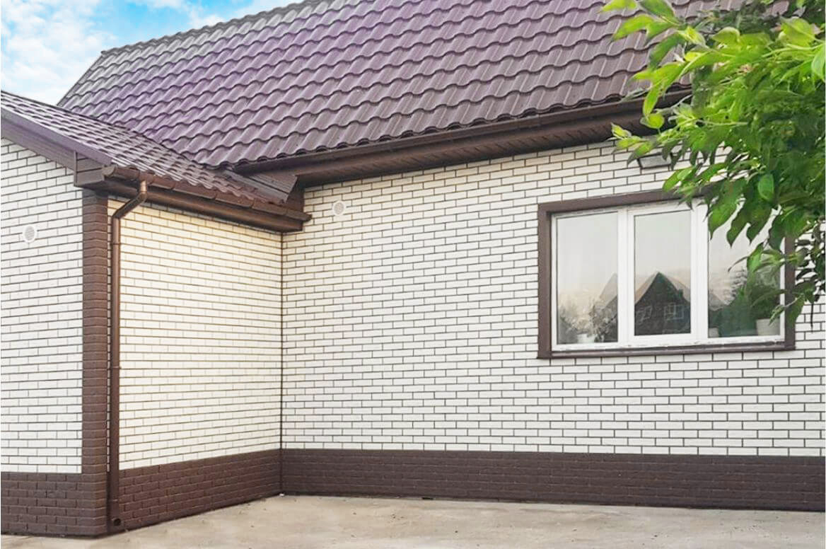Для цоколя использовали те же панели, но в коричневом цвете. Увеличенная высота OPTIMAL SIZE позволяет использовать их в цокольной зоне, при этом вся необходимая стандартная высота перекрывается одной панелью. Углы из той же коллекции аккуратно дополняют общий вид строения.