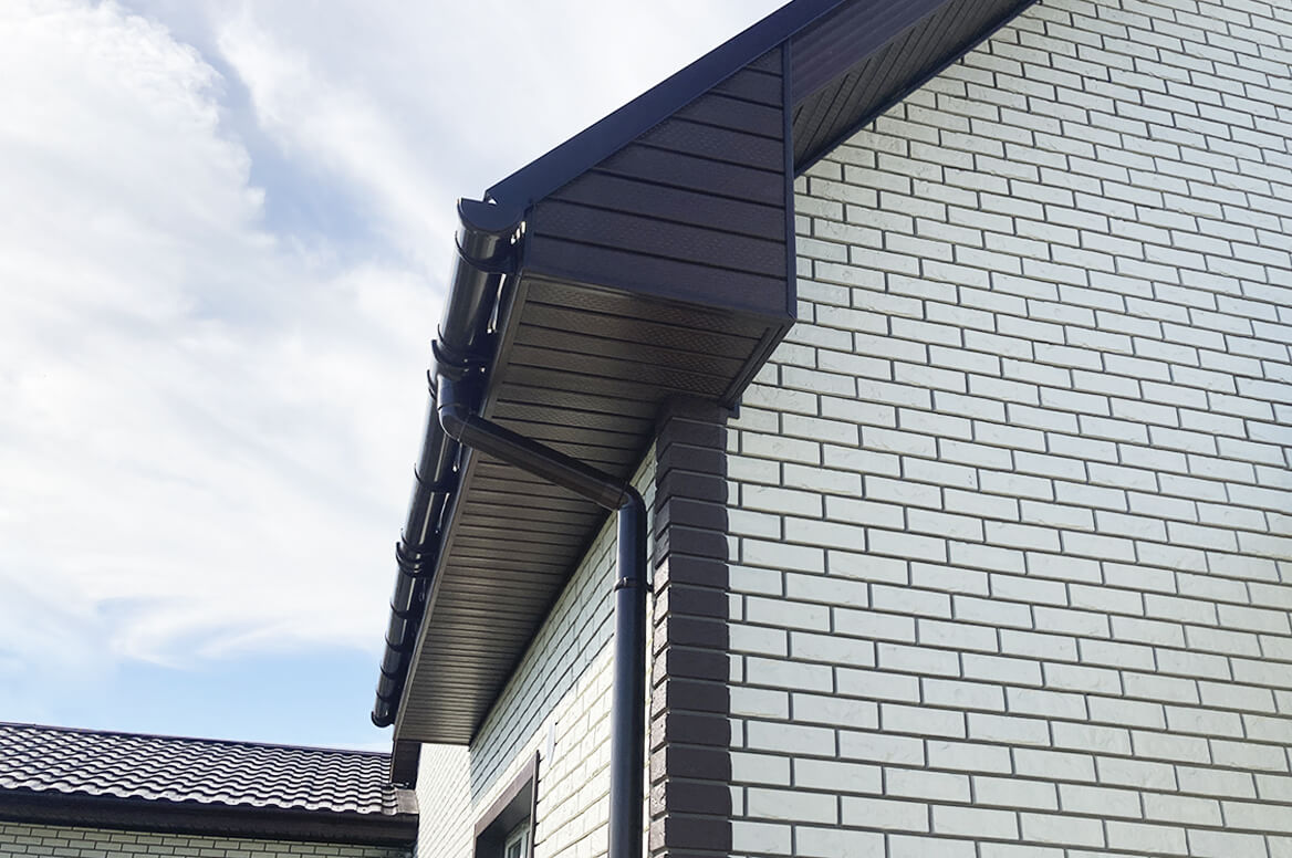 Для этой усадьбы также была выполнена обшивка карнизного свеса софитами в коричневом цвете, добавлены вентиляционные решетки, околооконные планки. Дом полностью обновился.