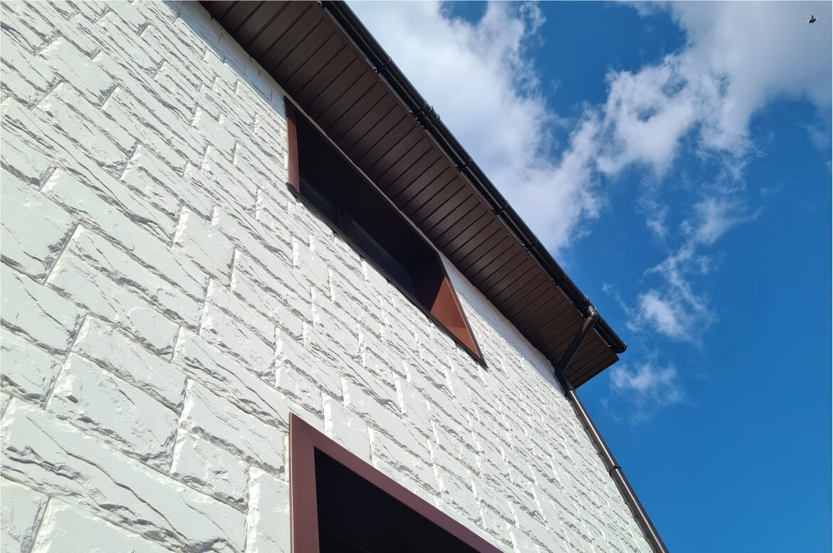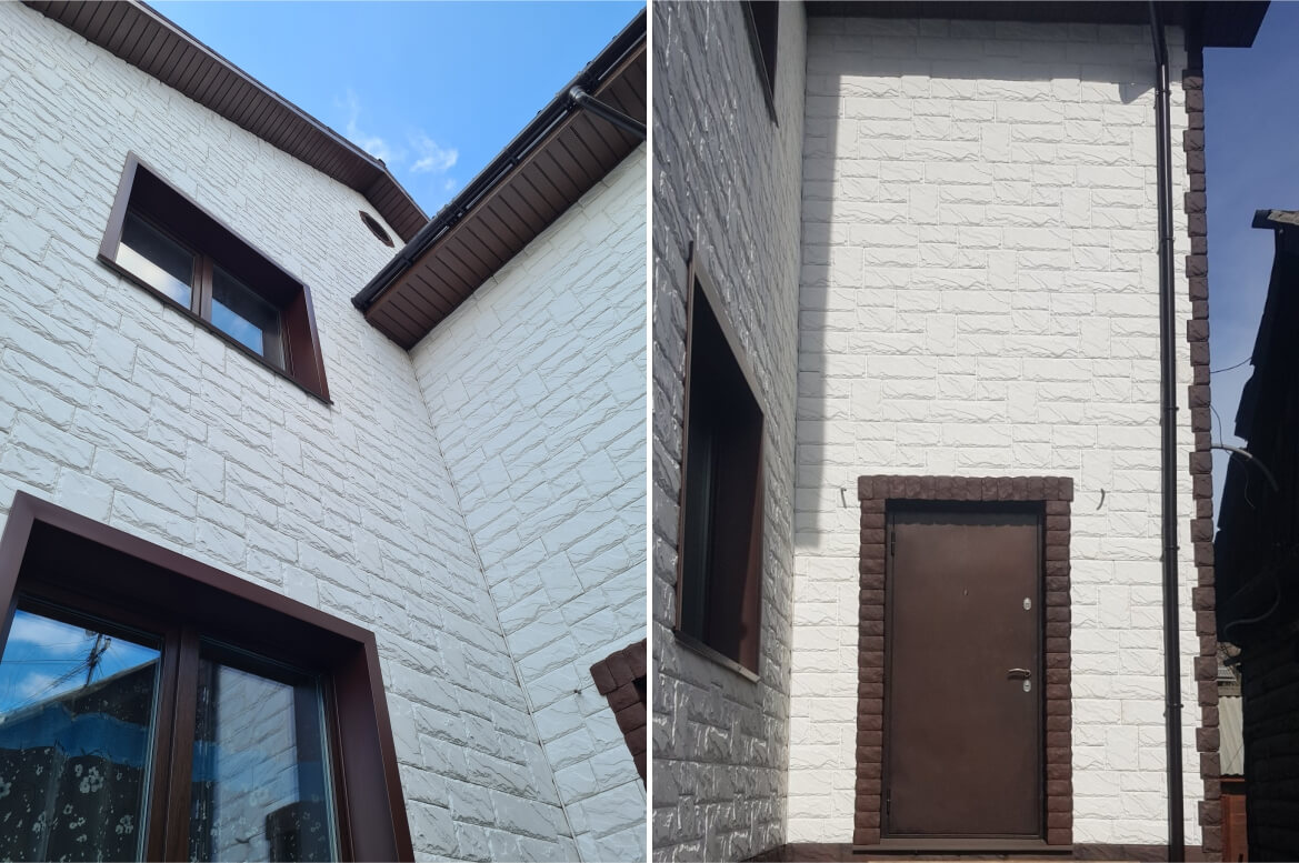 Фасад этого дома выполнен из белоснежных полипропиленовых фасадных панелей «Камень Крупный». Это очень красивые и качественные панели. Кстати, панели гладкие, их легко мыть. Белые панели, в отличие от всех остальных цветов, не выгорают на солнце. Для отделки цоколя и наружных углов применены панели из этой же коллекции, но коричневого цвета. И здесь есть одна хитрость. Чтобы домашние питомцы не пачкали белые панели, цоколь сделали чуть выше, чем он был. Монтаж выполнила компания «Март Маркет». Получилось здорово!