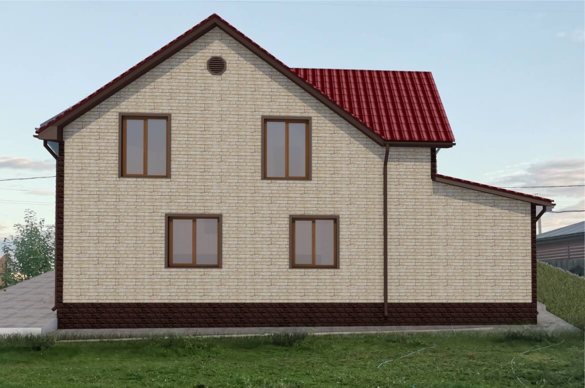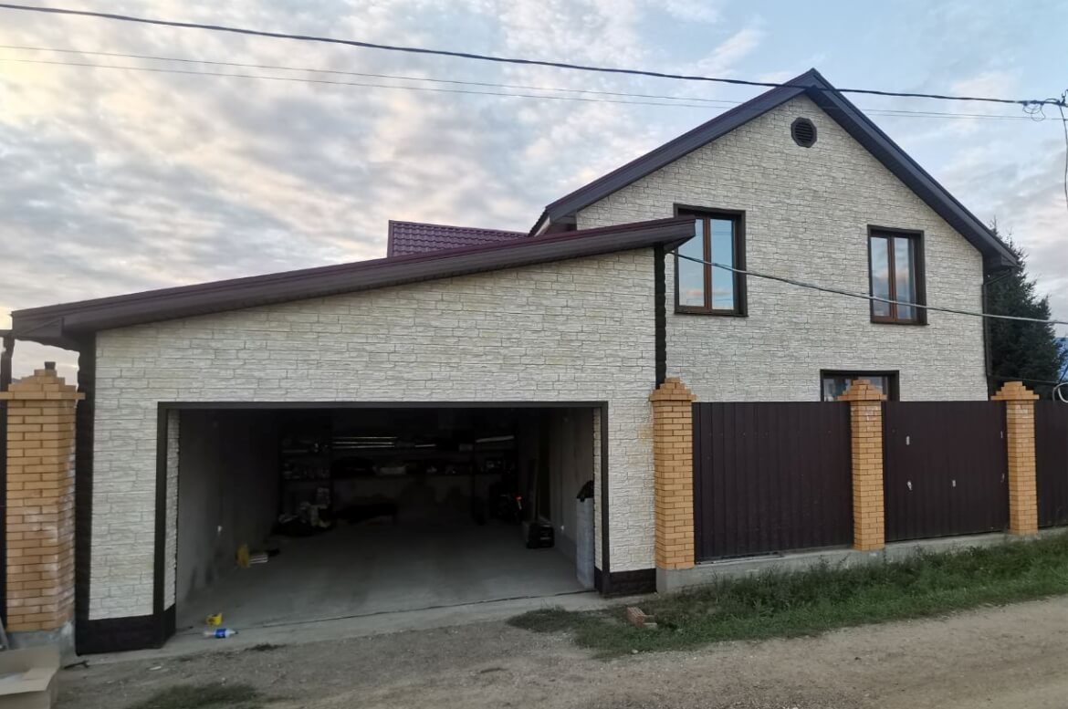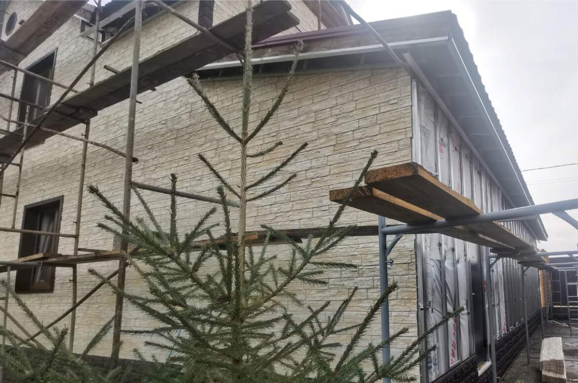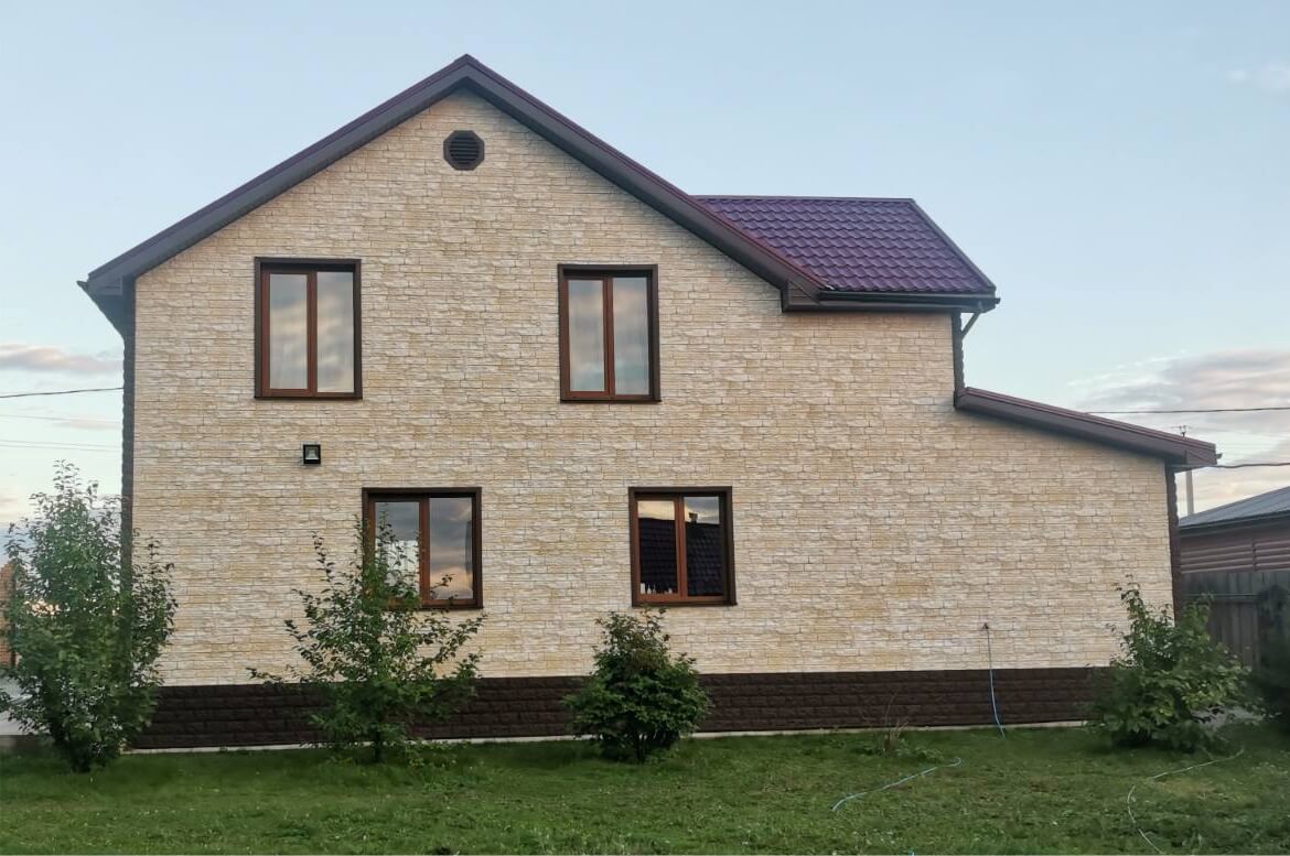 К панелям «Скала» в качестве декоративных элементов лучше всего подходят углы и цоколь с фактурой крупного камня «Доломит». Завершающим штрихом в отделке фасада является подшивка карнизов тёмными софитами и планками цвета «Могано» от FINEBER.