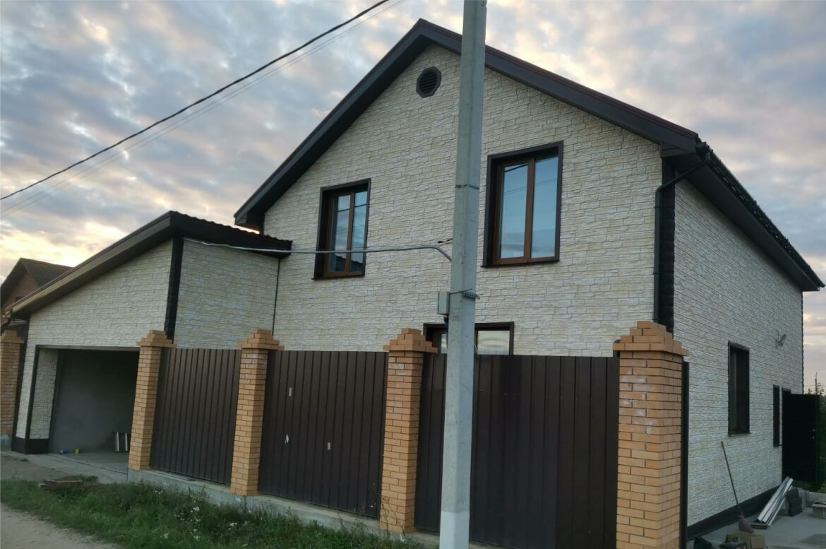 Большой дом сложной геометрии. Заказчик рассматривал различные варианты отделки и разные цветовые решения. Выбор был сделан в пользу ПВХ фасадных панелей от GRAND LINE серии «Я Фасад».