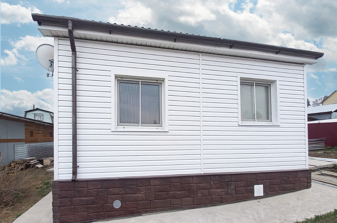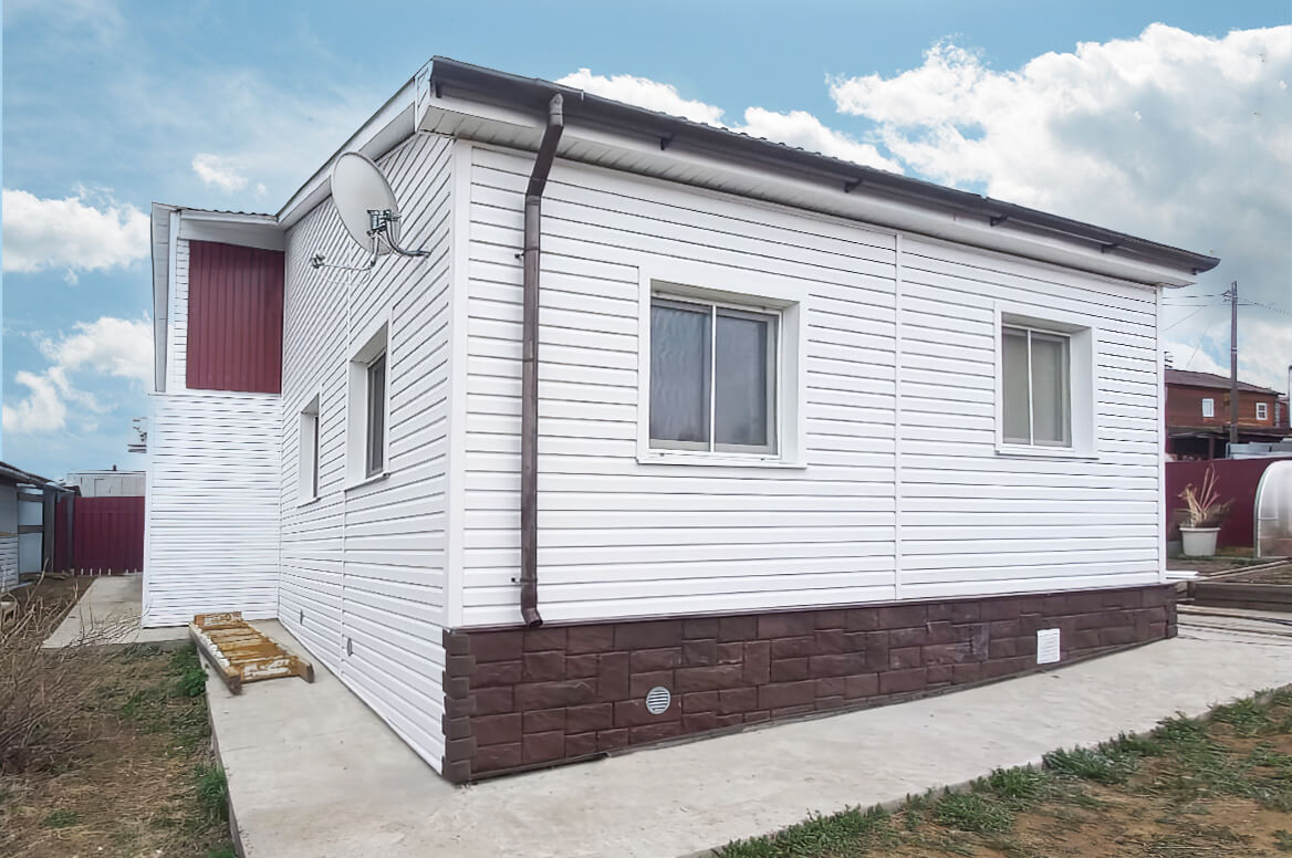 Еще одно преимущество белого цвета — он сочетается с любыми оттенками! В нашем случае, чтобы дом не смотрелся однообразно, хозяин выбрал коричневые панели для цоколя и коричневую водосточную систему.