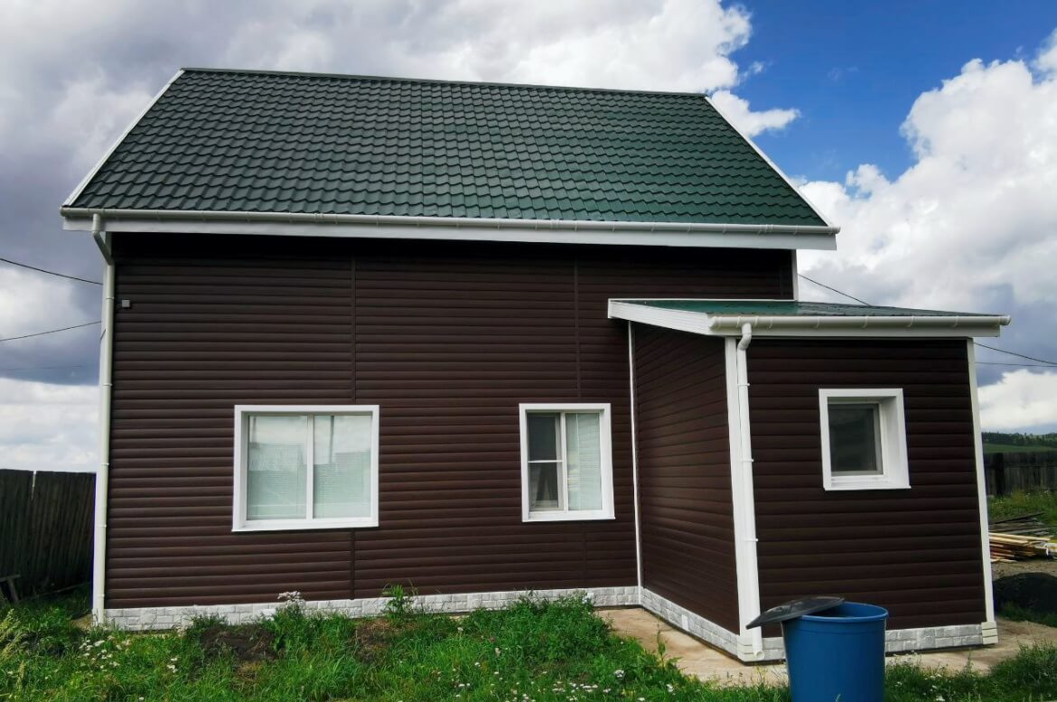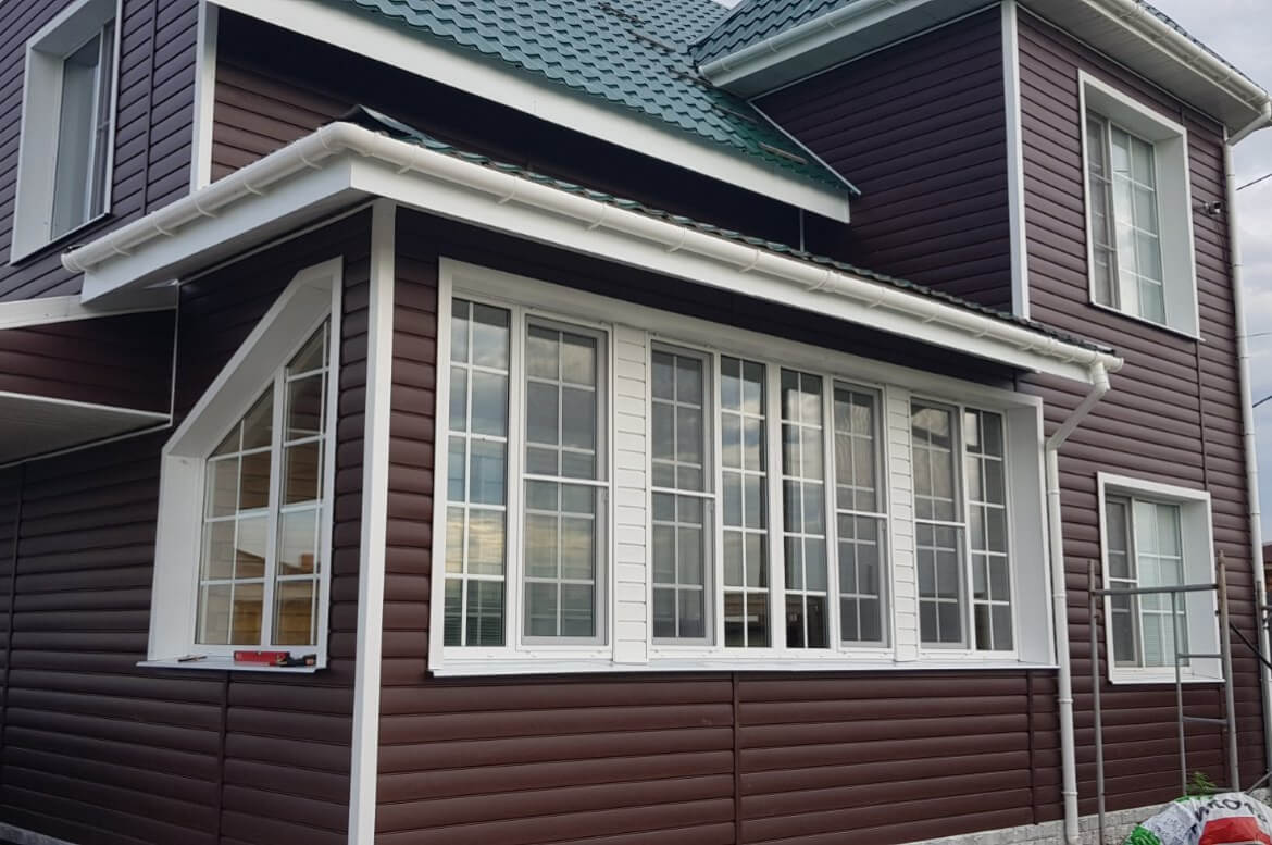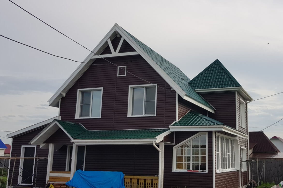 Владельцы этого дома в качестве основного материала отделки стен выбрали тёмный сайдинг «под бревно». У сайдинга красивая деревянная текстура и светостойкое акриловое покрытие. Цоколь выполнен на контрасте из ПВХ панелей ЯФасад «Екатерининский камень» Серебро.