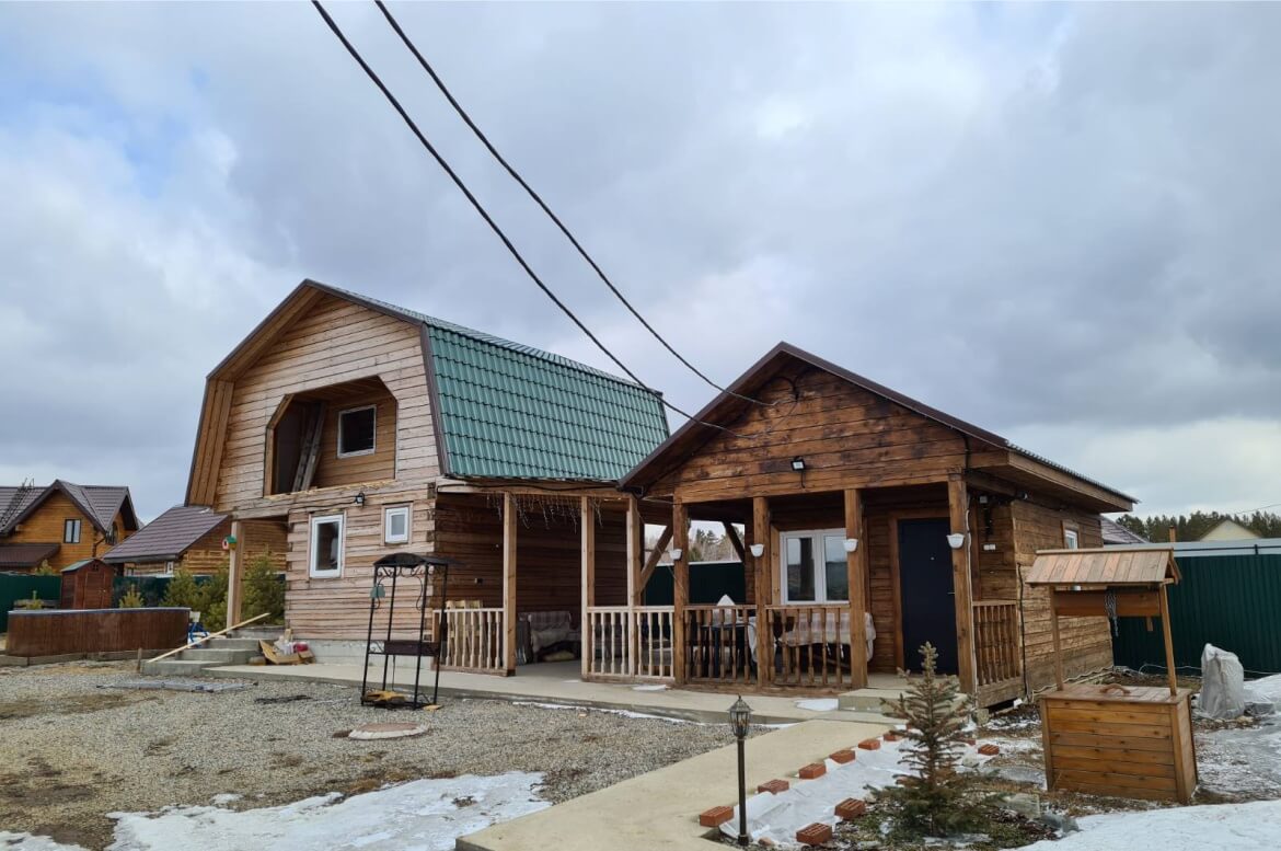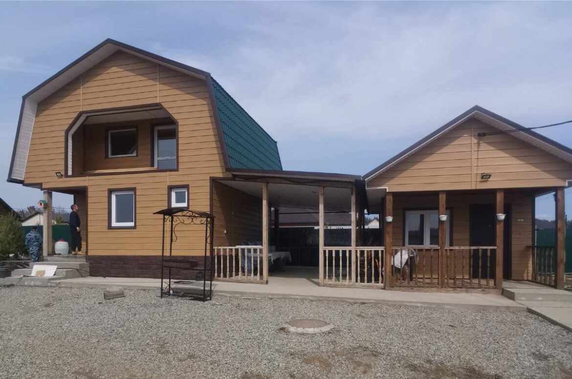 Дом и баня соединены общим навесом в единый ансамбль. Отделка наружных стен — красивый и качественный виниловый сайдинг «Natural-брус» от компании GRAND LINE. Сайдинг имитирует клеёный брус. Высота панели 18 см, как у настоящего бруса. Отличный вариант для отделки деревянного дома, если нужно его утеплить, но вы не хотите кардинальных изменений. Цоколь выполнен из жестких полипропиленовых панелей «Камень Крупный» от FINEBER. Кстати, цоколь нарастили на высоту одного бруса, чтобы он был вровень во входом. Подшивка карнизов и навеса из софитов FINEBER белого цвета.