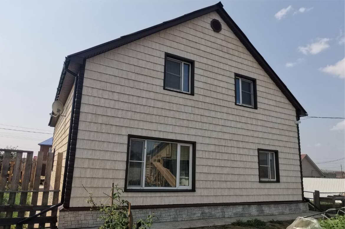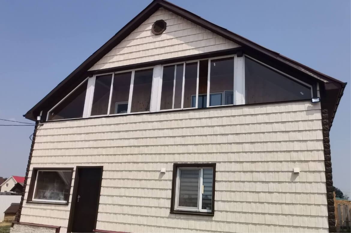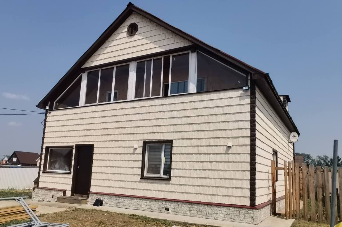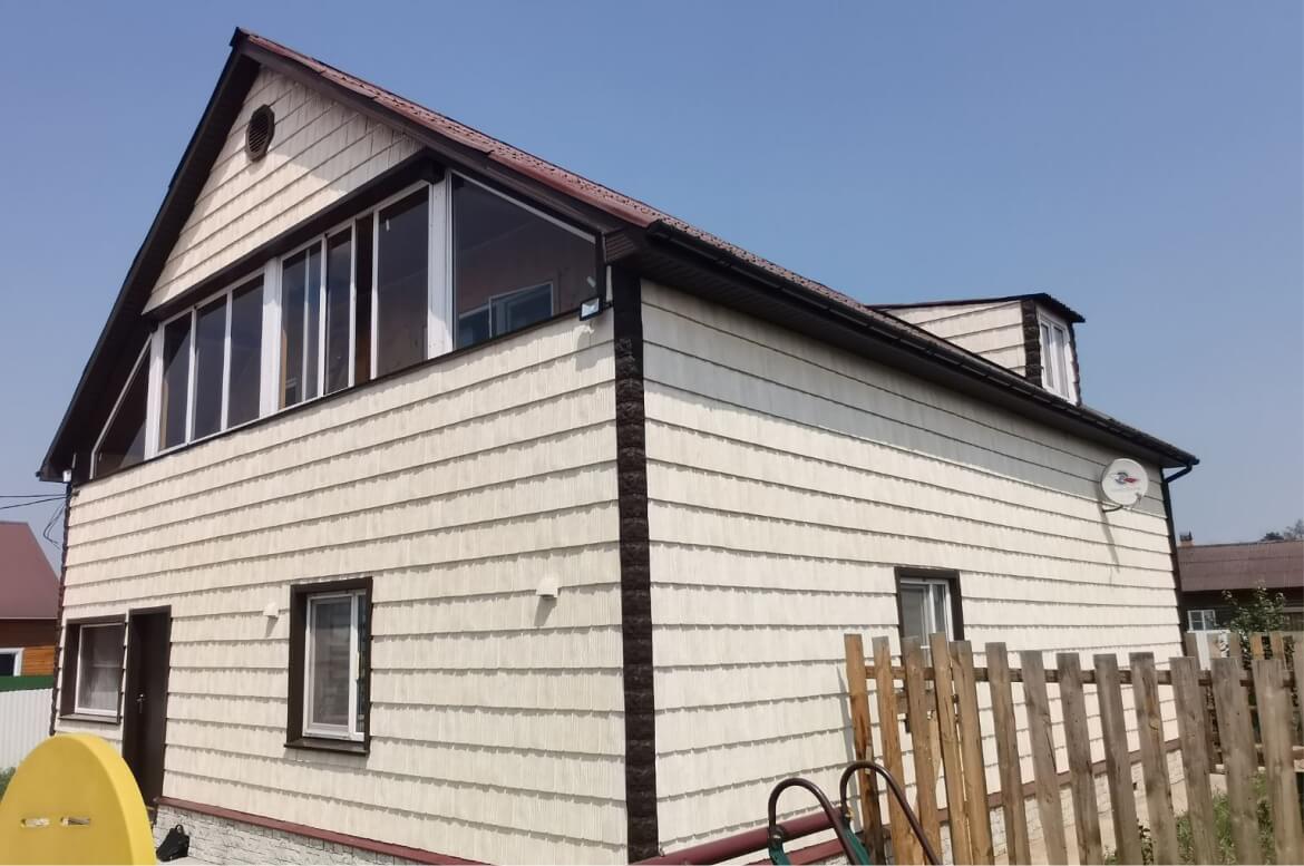 «Дранка сибирская» от GRAND LINE — фактурная фасадная панель имитирующая отделку фасада натуральной щепой. Цвет очень мягкий, с переливами тёплых оттенков. Панель легко монтировать: не нужно совмещать рисунок, при этом обрезков не остается. Светлый фасад отлично дополняют углы «под камень» тёмного цвета. Контрастная отделка необходима и для того, чтобы уравновесить тяжелый верх, поскольку кровля и подшивка свеса тёмные.