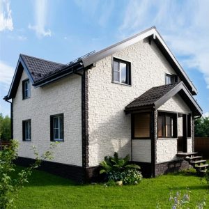 Светлые цвета всегда придают зданиям воздушности, легкости и невесомости. Особенно это важно, если вы хотите выполнить облицовку не только жилого дома, но и прилегающих построек — гаражей, бань, летних кухонь, других хозяйственных помещений. На фото вы видите дом, хозяева которого решели сделать именно так — произвести оттделку всей усадьбы в едином стиле.