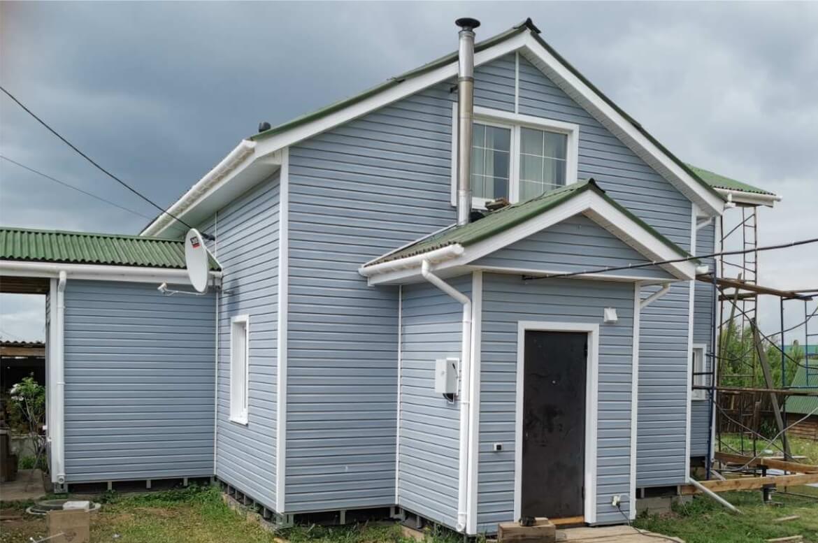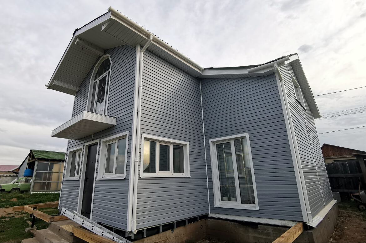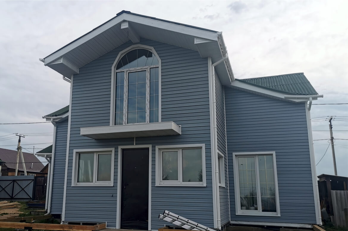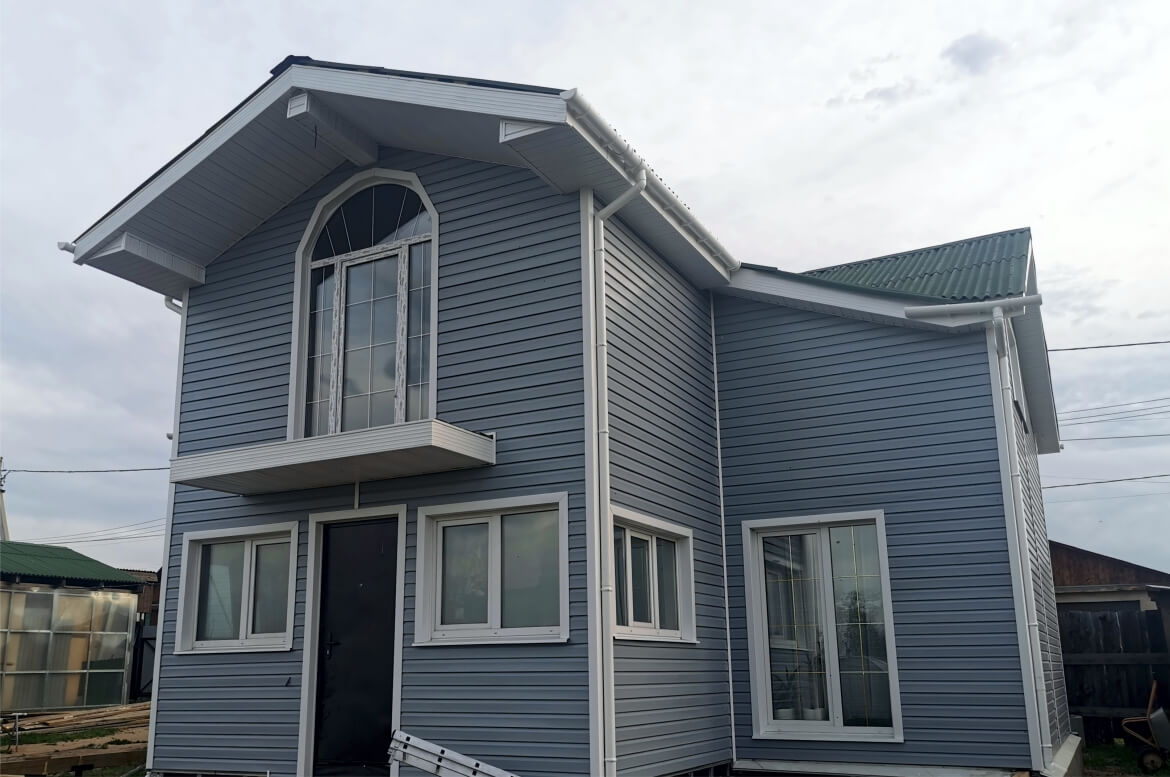 Когда заказчики подбирали сайдинг, они сразу остановили свой выбор на серо-голубых панелях от FINEBER. Оказалось, это именно тот цвет, который они хотели. Серо-голубой цвет в коллекции “Standart” очень необычный, сложный, меняется при разном освещении от серого до насыщенного голубого. В то же время, белая отделка углов и карнизных свесов выгодно подчеркивает красивый, многодельный контур фасада.