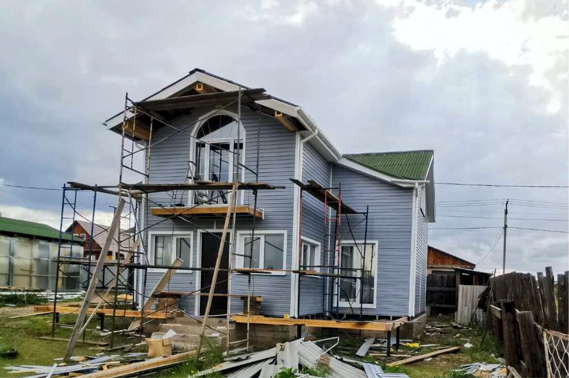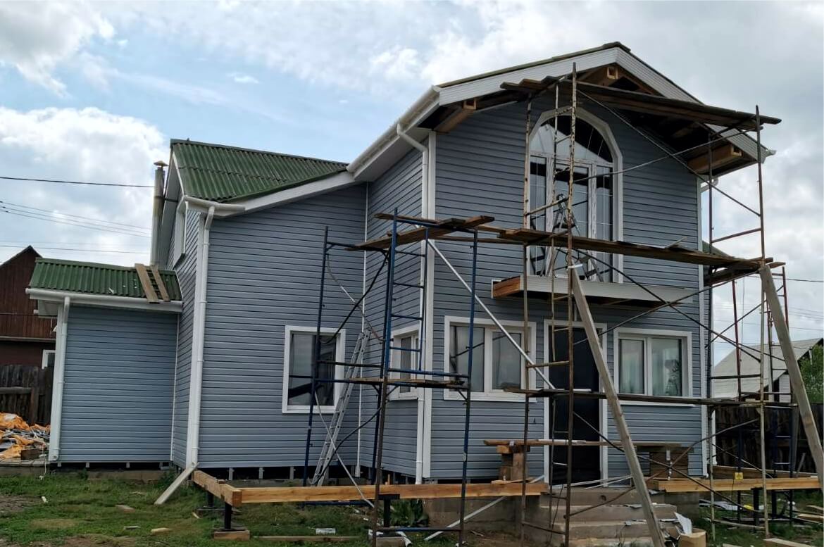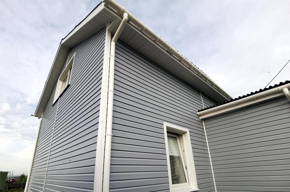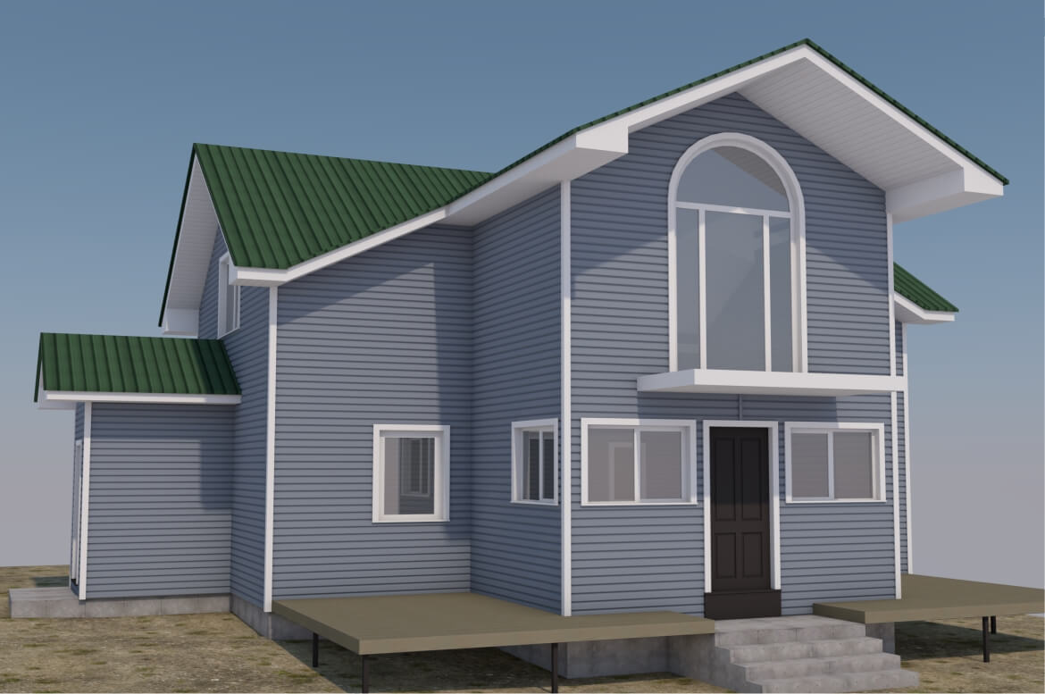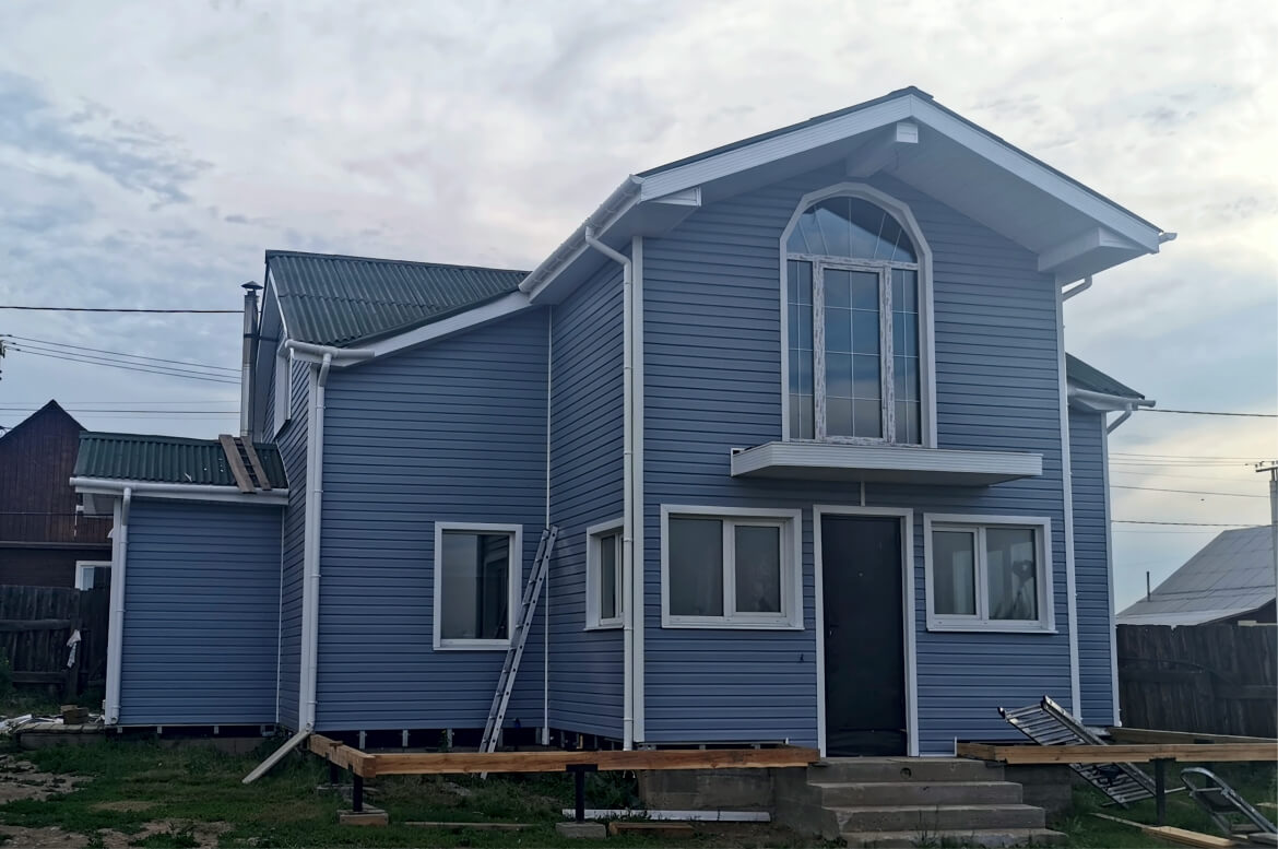 Когда заказчики подбирали сайдинг, они сразу остановили свой выбор на серо-голубых панелях от FINEBER. Оказалось, это именно тот цвет, который они хотели. Серо-голубой цвет в коллекции “Standart” очень необычный, сложный, меняется при разном освещении от серого до насыщенного голубого. В то же время, белая отделка углов и карнизных свесов выгодно подчеркивает красивый, многодельный контур фасада.