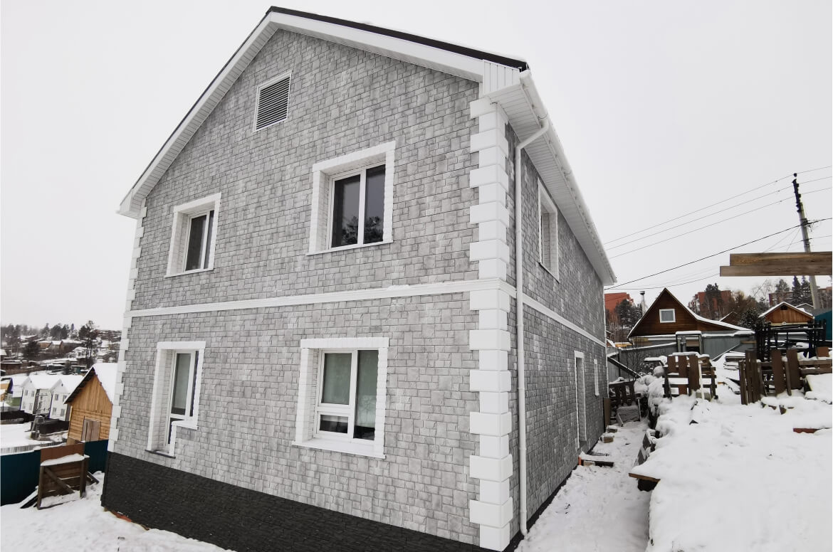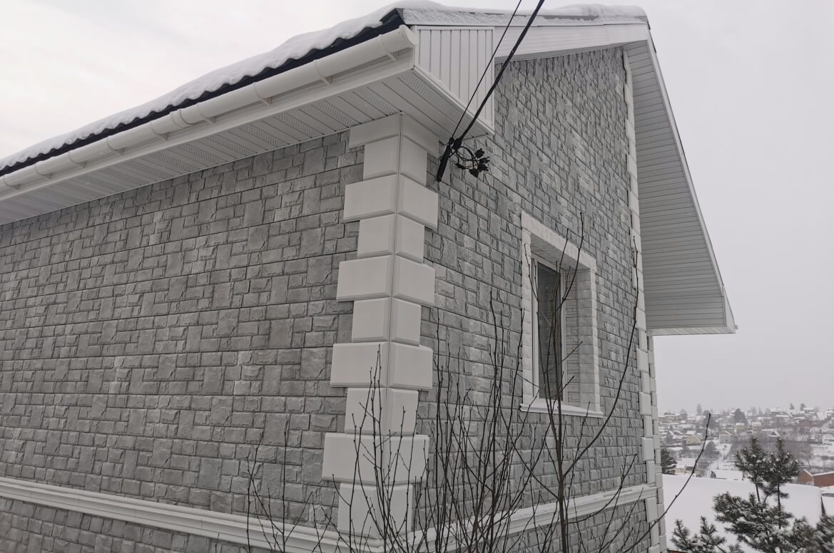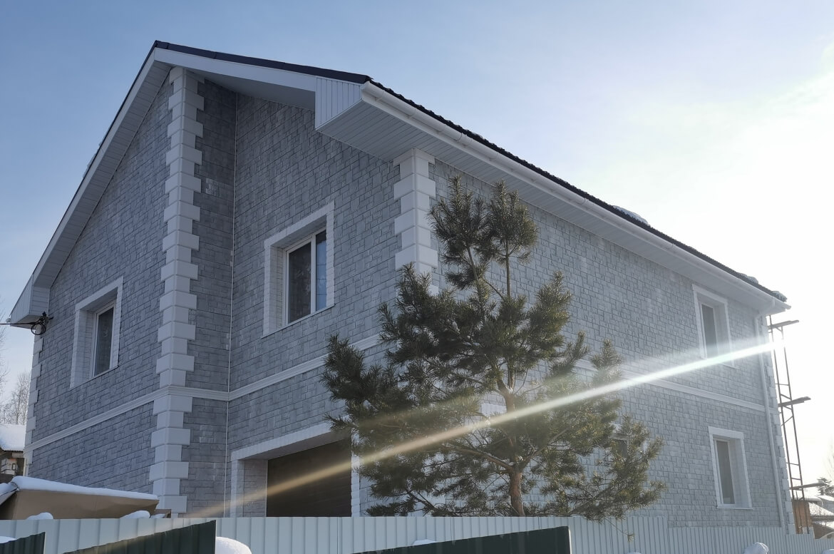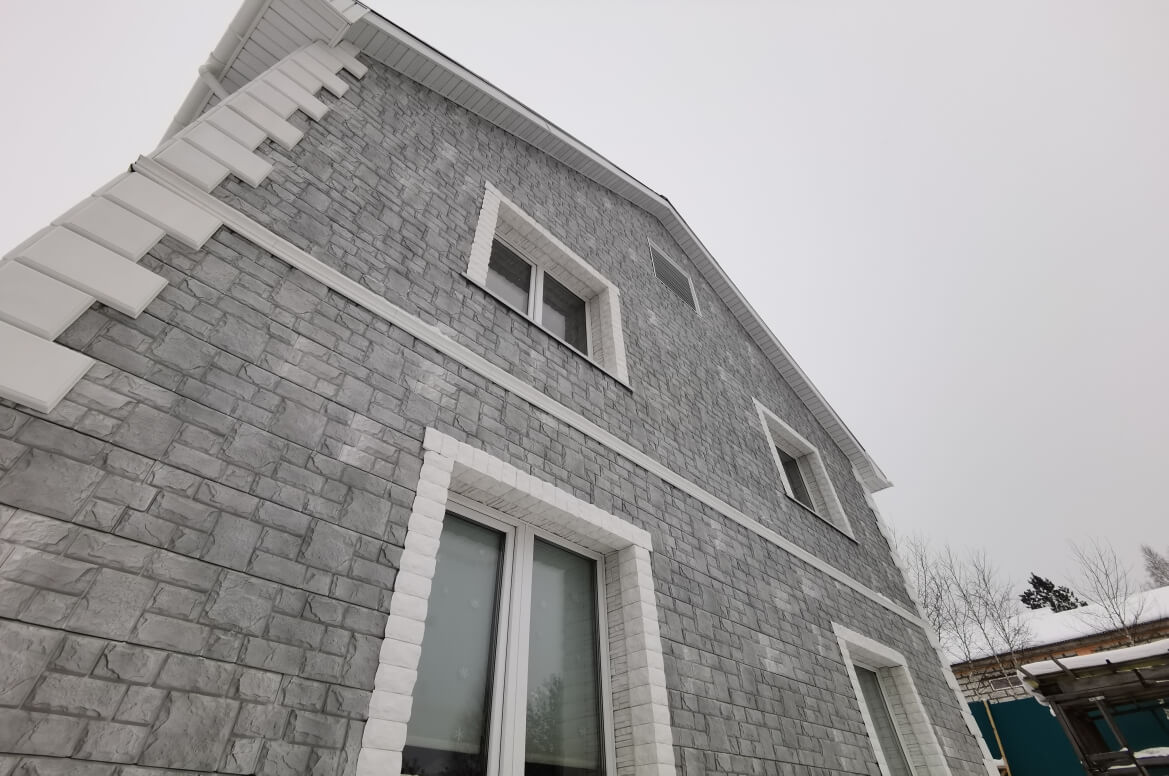 «ЯФасад» дороже обычного ПВХ сайдинга, но значительно дешевле привычных полипропиленовых фасадных панелей. Материал имитирует отделку крупным тесанным камнем. Ярко выраженная текстура поверхности и сложное окрашивание панелей формируют очень привлекательный внешний вид фасада. В качестве аккомпанемента к панелям цвета Серебро подобрали цокольные панели Кварцевого цвета коллекции «Скала» от FINEBER. Получилось очень интересное контрастное сочетание серых оттенков на фасаде. Ну, и конечно же, образ был бы не полным без белоснежной отделки «Альта-декор» от АЛЬТА ПРОФИЛЬ. Монтаж выполнила компания «Март Маркет».