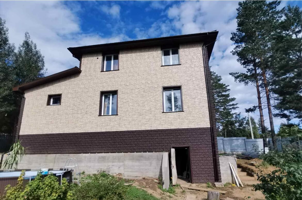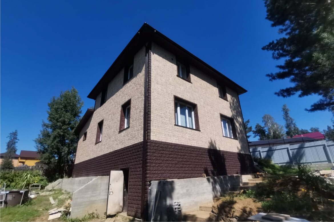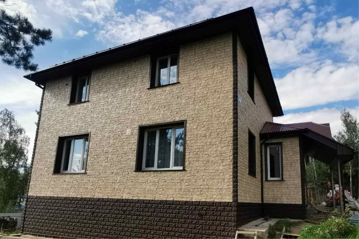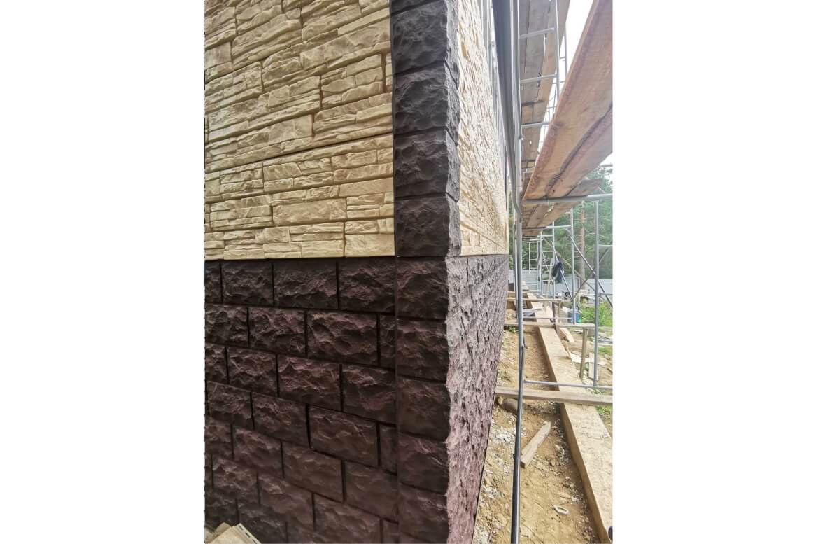 Цоколь, отделка углов — фасадные панели FINEBER «Доломит» цвет Тёмно-коричневый.