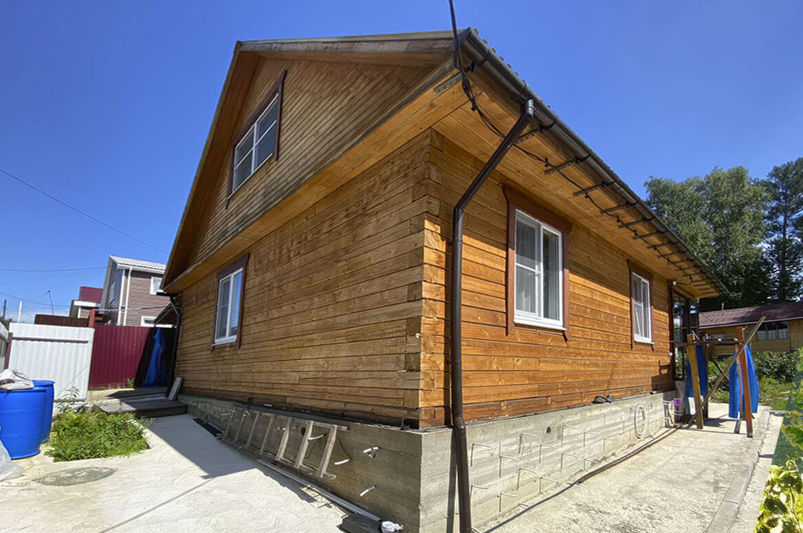 Цоколь дополняет отлив в цвет фасада. Углы, окна и карнизы выделены белым цветом.