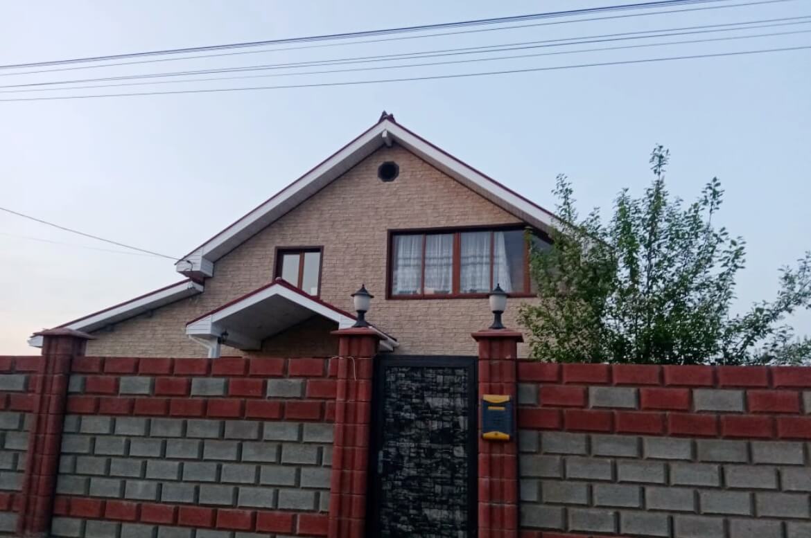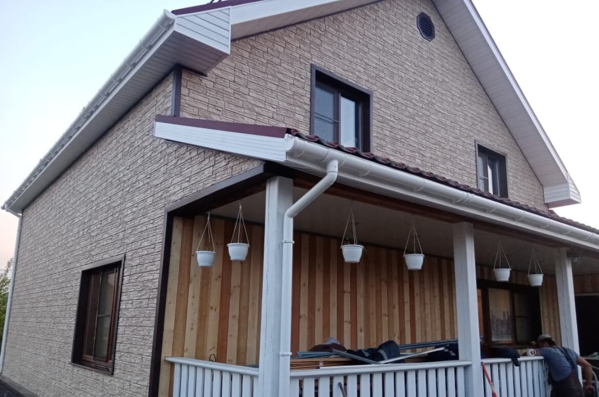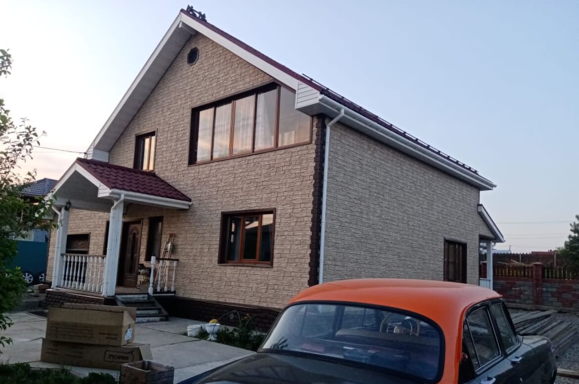 Для отделки фасада использован очень практичный материал — формованный ПВХ сайдинг «ЯФасад» от компании GRAND LINE. Материал обладает отличными эксплуатационными характеристиками: небольшим, по сравнению с полипропиленовыми панелями, коэффициентом линейного расширения, устойчивостью к механическим воздействиям, повышенной цветостойкостью. Глубокая фактура поверхности этих фасадных панелей имитирует скальную породу. Мелкий рисунок рельефа панели создаёт цельную поверхность фасада без швов и видимого повтора рисунка. Кстати, эта панель отлично сочетается с цокольной полипропиленовой панелью из коллекции «Колотый камень». Для отделки наружных углов и окон использованы аксессуары «ЯФасад» из акриловой коллекции цвета Темный дуб. На главном фасаде наружные углы оформлены «Колотым камнем». На фронтонах установлены фасадные решетки KROVENT, красивое и функциональное дополнение к фасаду.