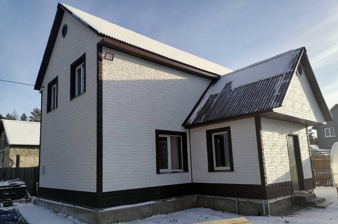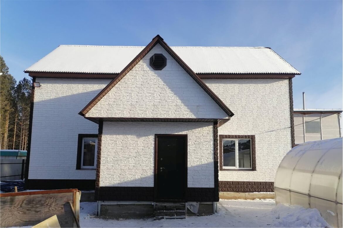 Цоколь, углы, отделка окон — фасадные панели FINEBER «Доломит» цвет Темно-коричневый.